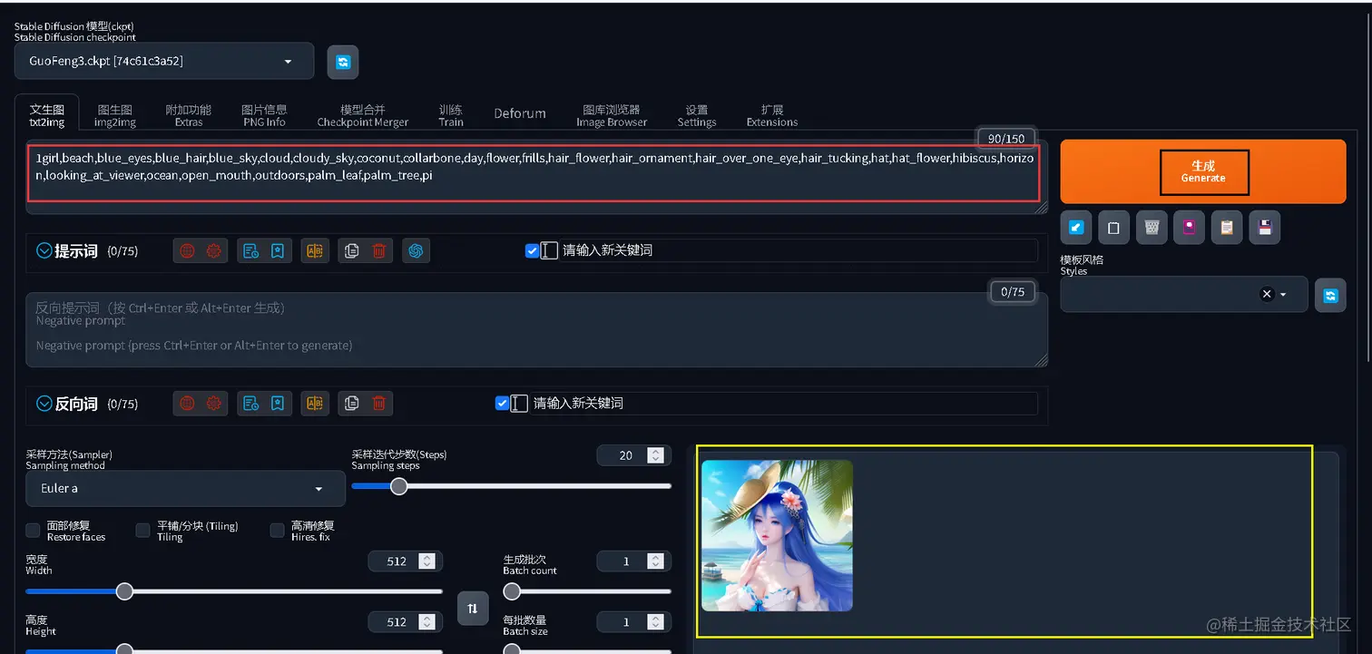 Stable Diffusion WebUI把Stable Diffusion模型进行了封装,使用极其方便,点击即用。对于Stable Diffusion模型输入Prompt时,细节刻画越好,图片越好看。