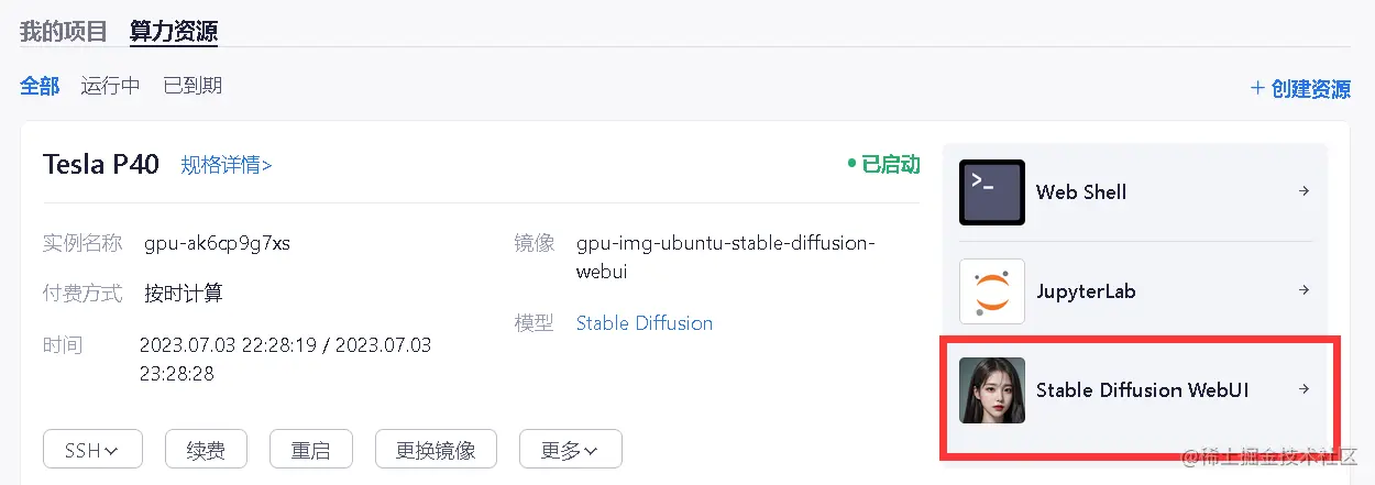 此环境主要用于学习和使用Stable Diffusion,已经安装了相关软件和组件库,可直接启动Stable Diffusion WebUI进行创作