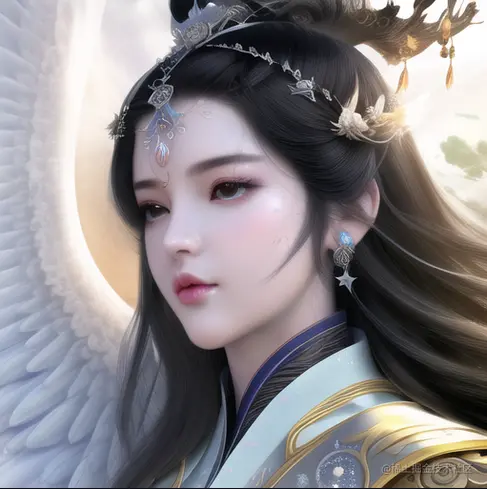(profile picture), close up portrait, exquisite facial features, (prefect face), shiny skin, [abstract background], female, solo, scientist, (masterpiece), best quality, official art, extremely detailed CG unity 8k wallpaper, highly detailed, macro lens, princess, wide eyes, hubrael, black hair, summer dress, standing, universe, (sunlight),(angel),dynamic angle, floating, wing, halo, floating white silk,(Holy Light),silver stars