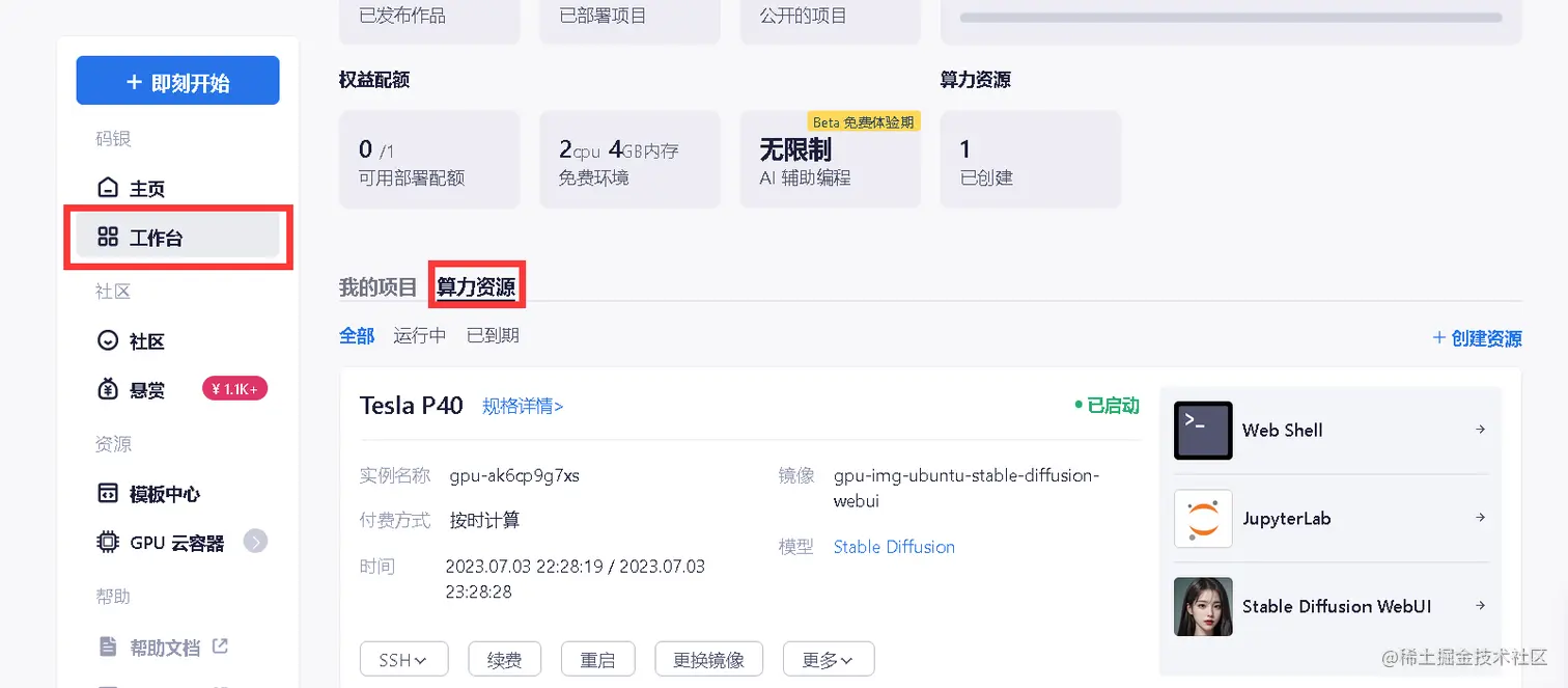 4.打开工作台并选择算力资源