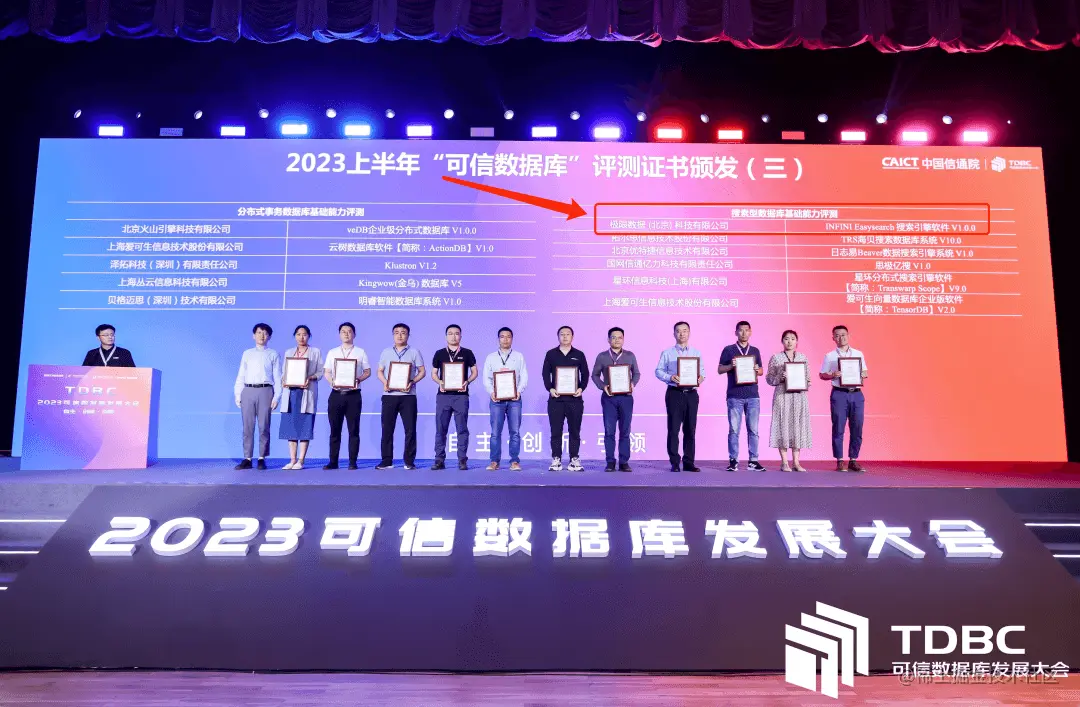 7 月 4 日,由中国通信标准化协会和中国信息通信研究院主办,大数据技术标准推进委员会承办,InfoQ 联合主办的 2023 可信数据库发展大会 在京隆重召开,中国信通院云计算与大数据研究所大数据与区块链部主任姜春宇在主论坛现场颁发评测通过证书,极限科技相关代表受邀出席领取。
