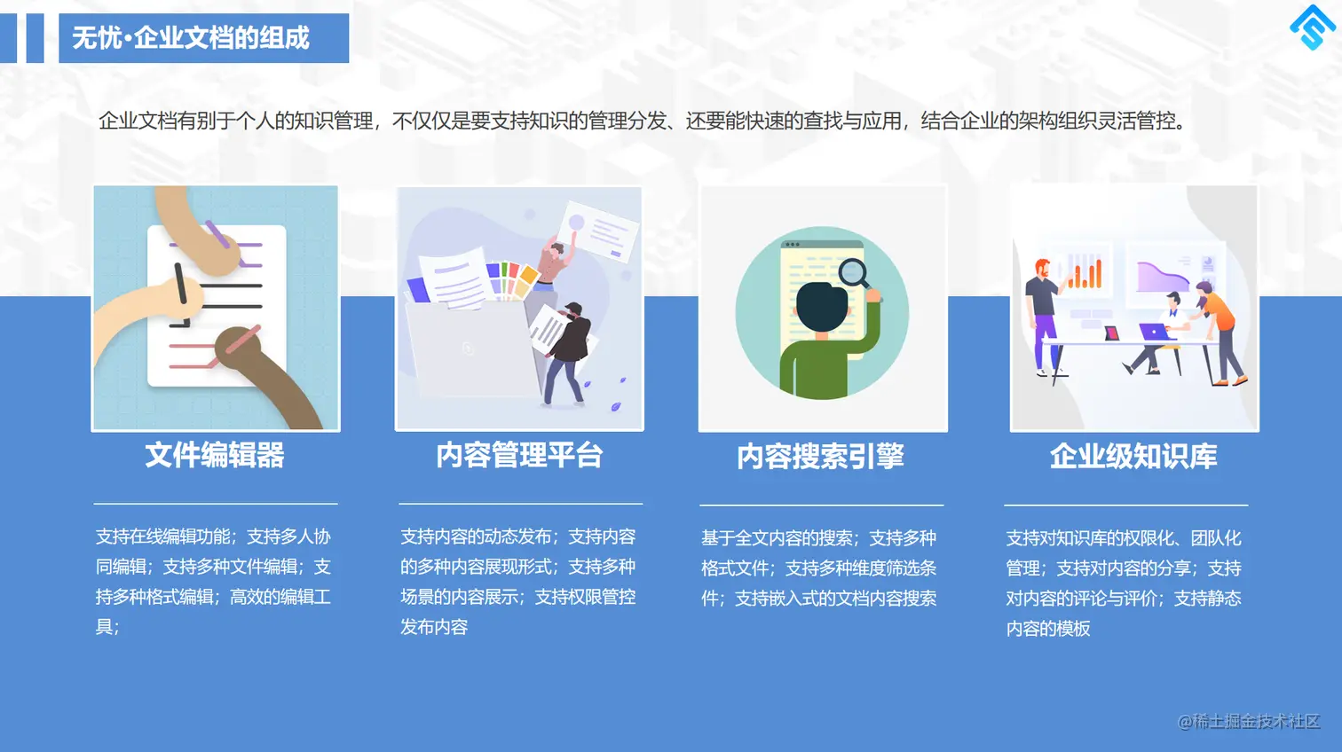 - 文档查找麻烦,无法实现基于内容的查找,无法实现公司级搜索