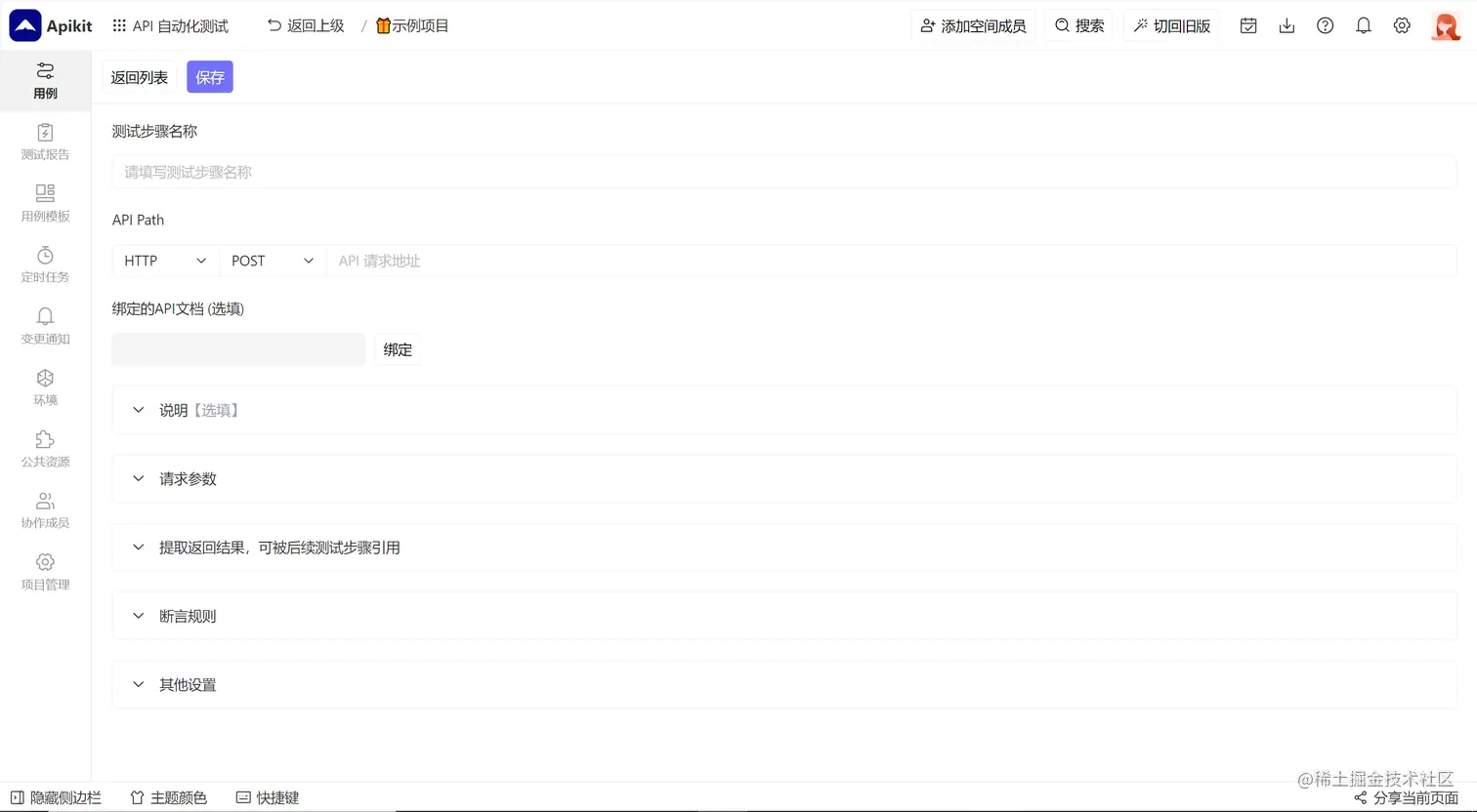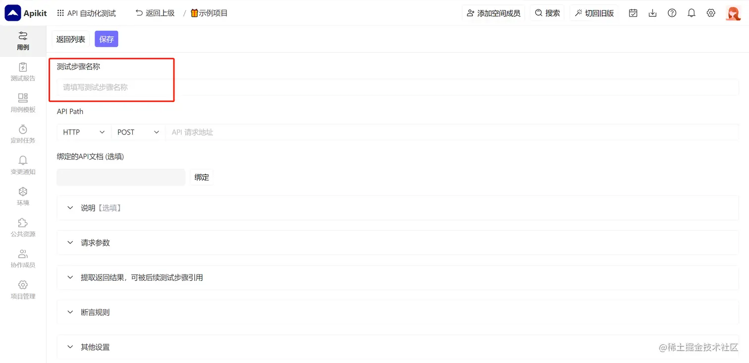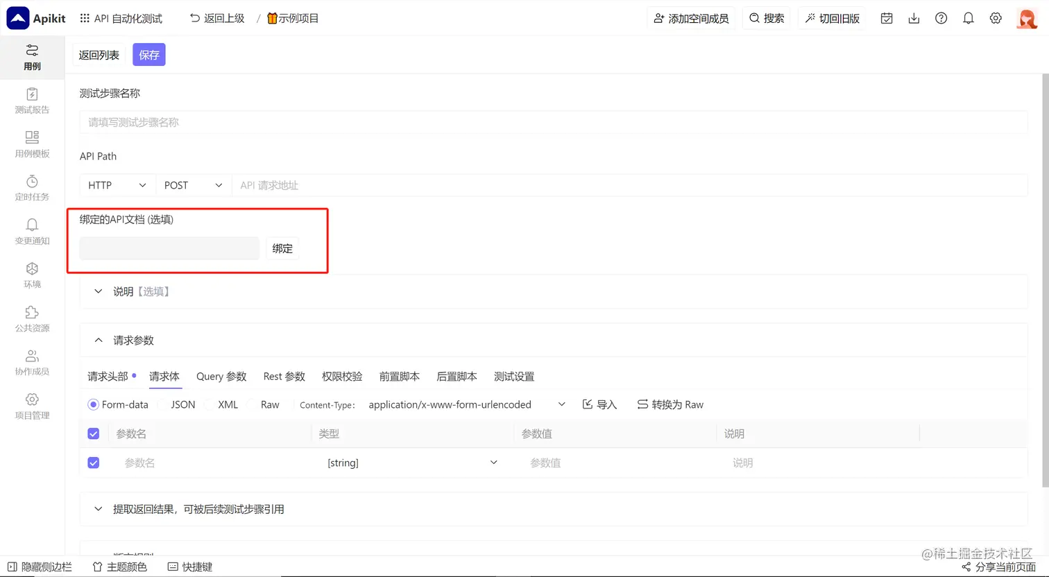 测试步骤基本信息 :包括测试步骤名称、API请求地址、绑定的API文档等;