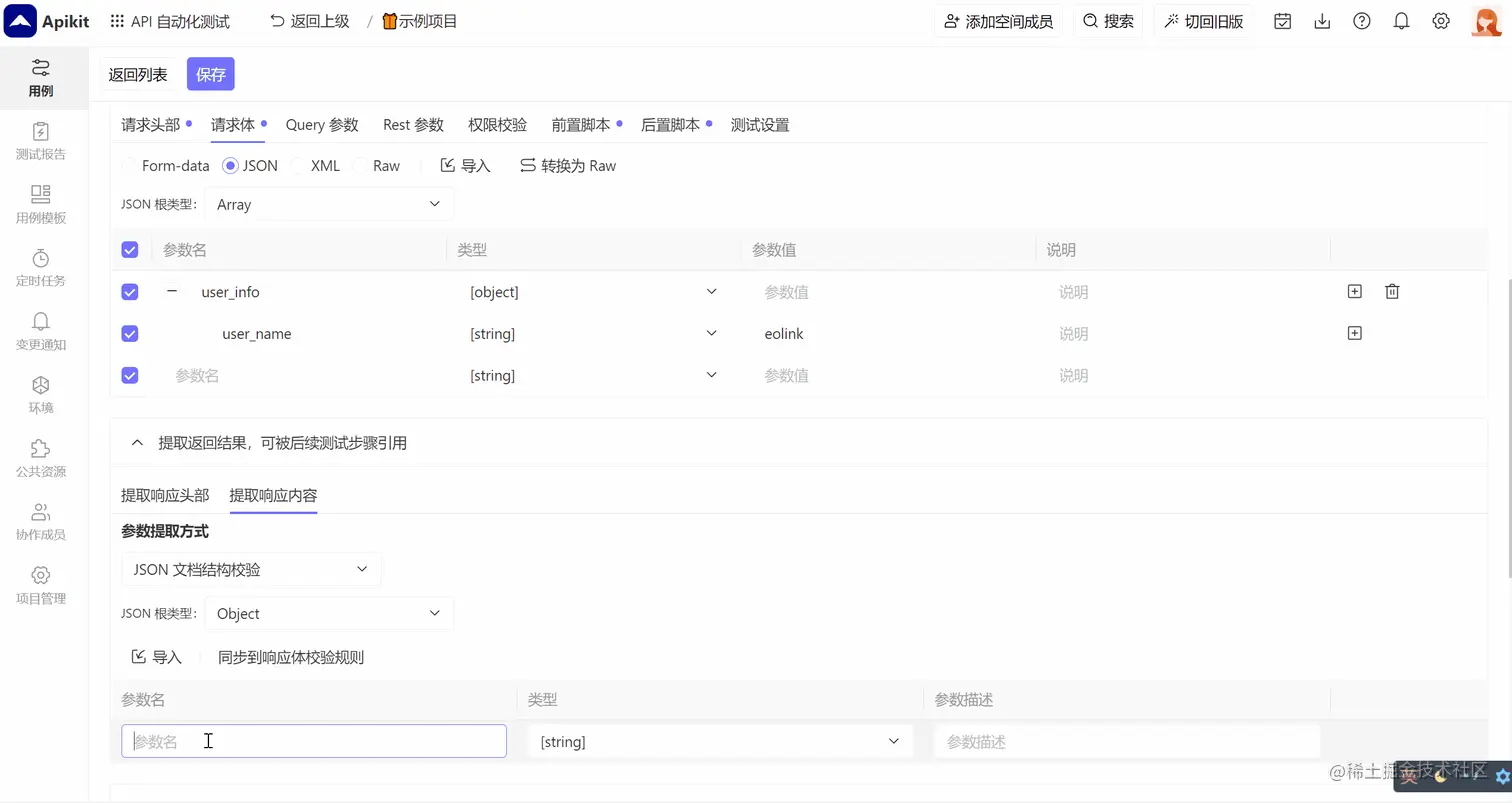 比如现有 json 返回结果:{“user_info”:{“user_name”:”eolinker”,”user_password”:”123456”,”user_type”:”normal”}}希望提取返回结果中user_info对象里的user_type字段的值,并且传递给后续测试步骤使用,那么在提取返回结果一栏中选择返回数据类型为 json,json最外层为对象,在表格中填写需要提取的字段在返回结果中的位置即可: