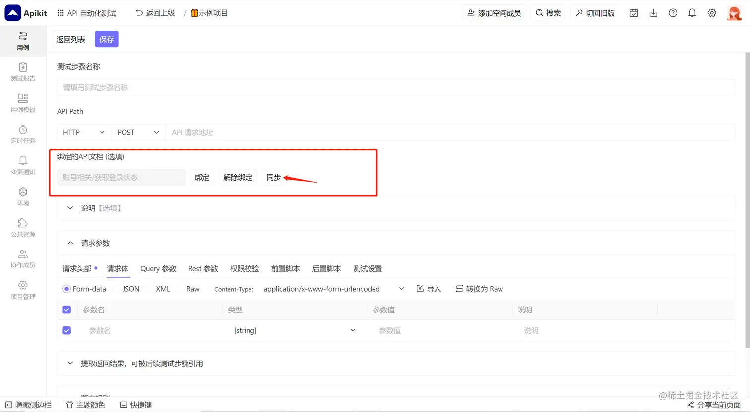 当API文档发生变化时,你可以在测试步骤的编辑页面点击同步按钮更新当前API测试步骤;