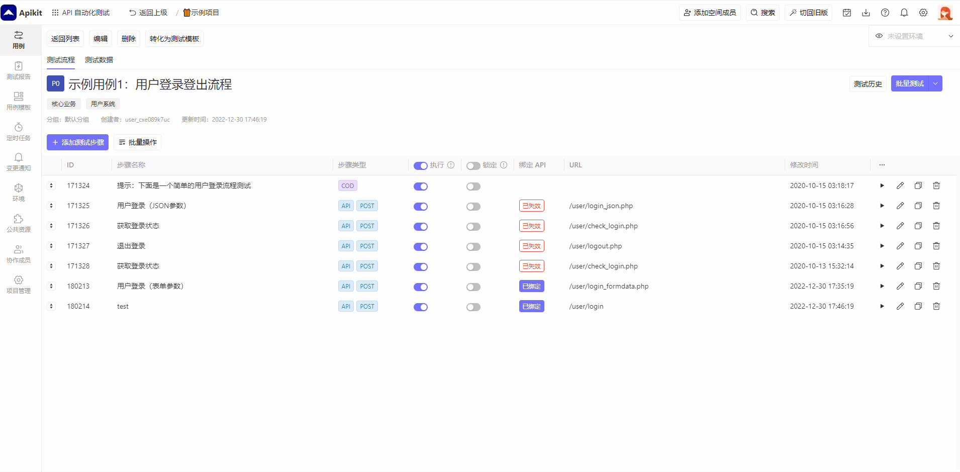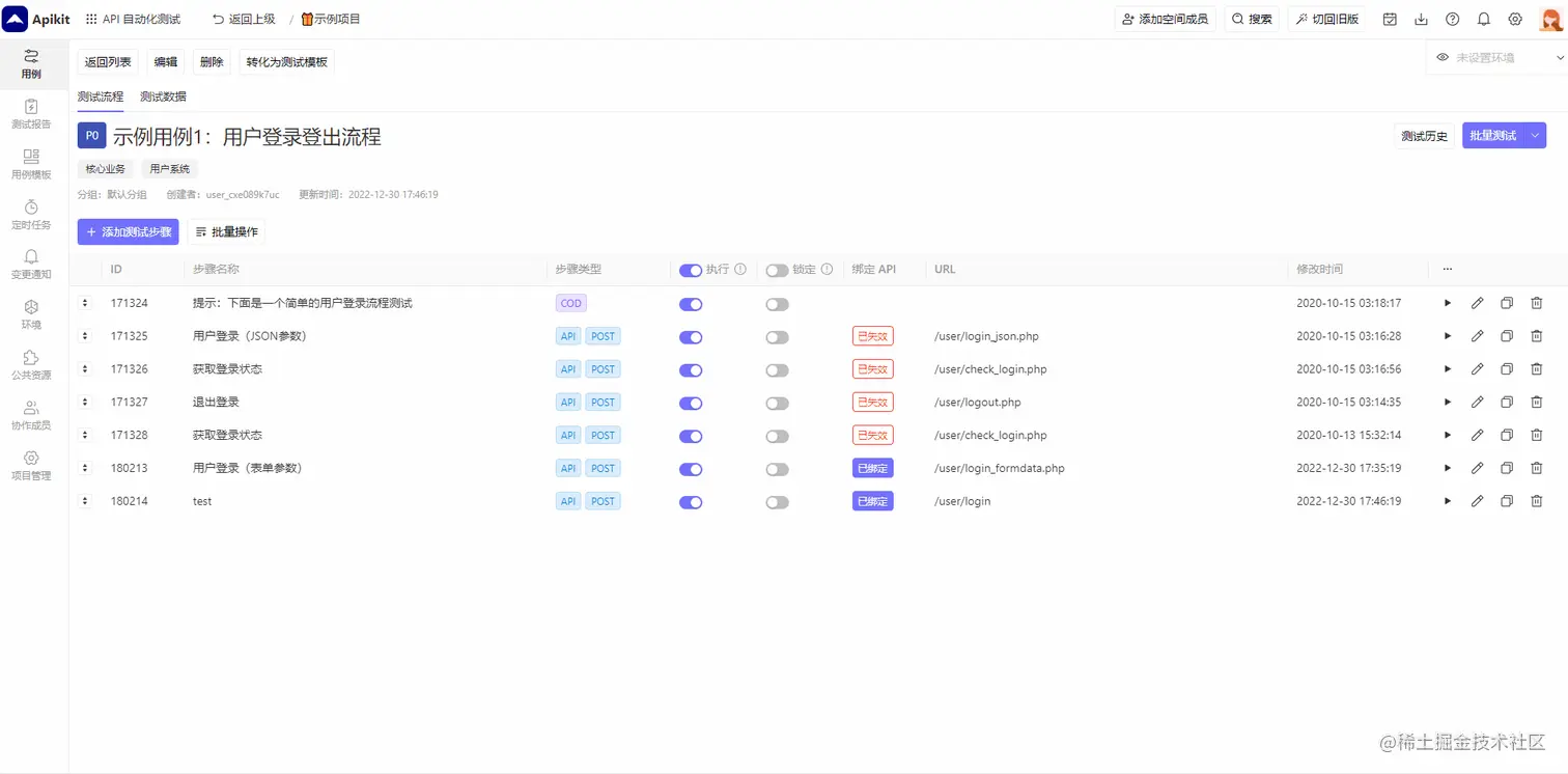 或者是测试用例详情页通过批量操作来更新多个API测试步骤。