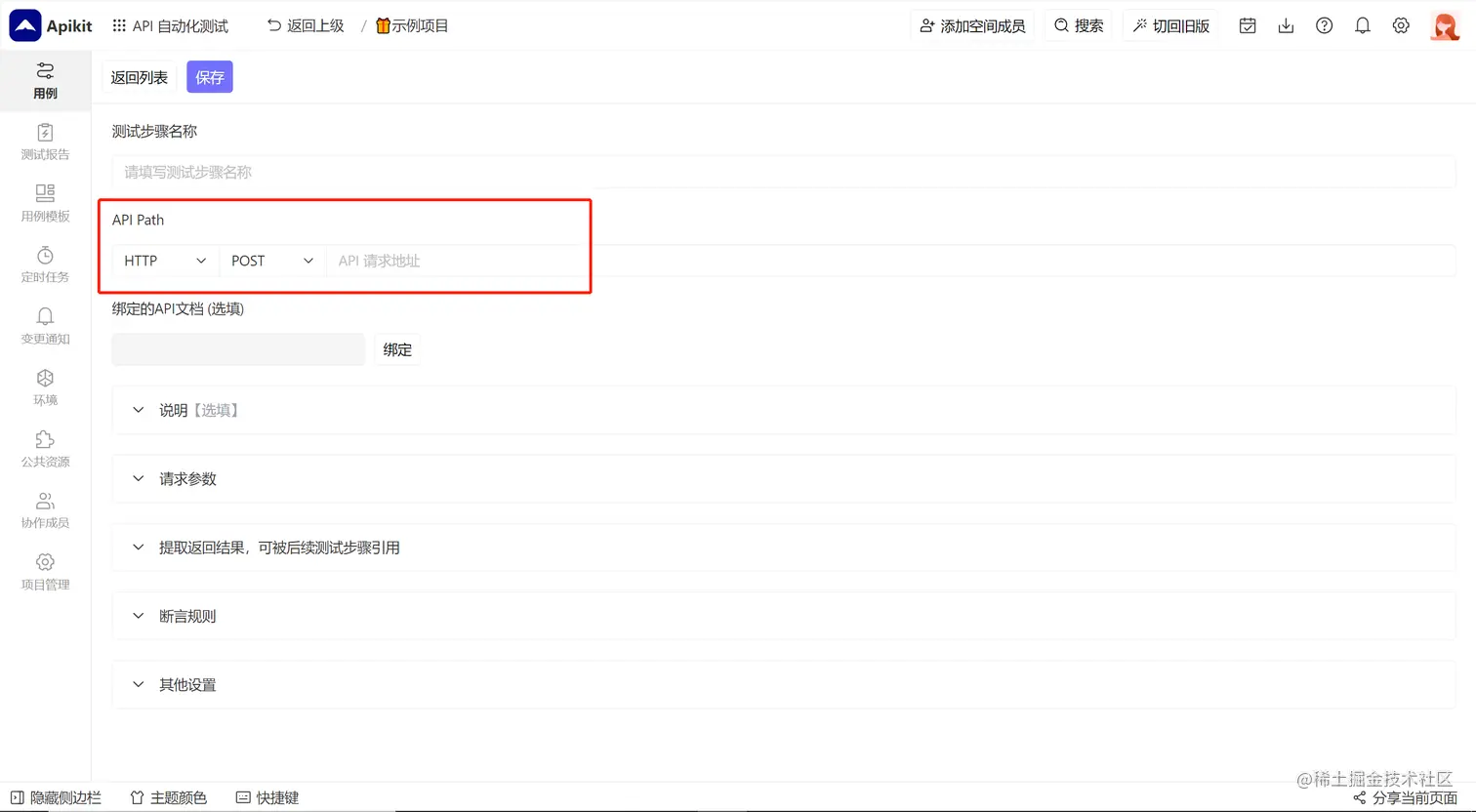 设置 API 测试的地址,建议只输入 API 地址的 Path 部分,Host 部分通过项目环境管理来设置。