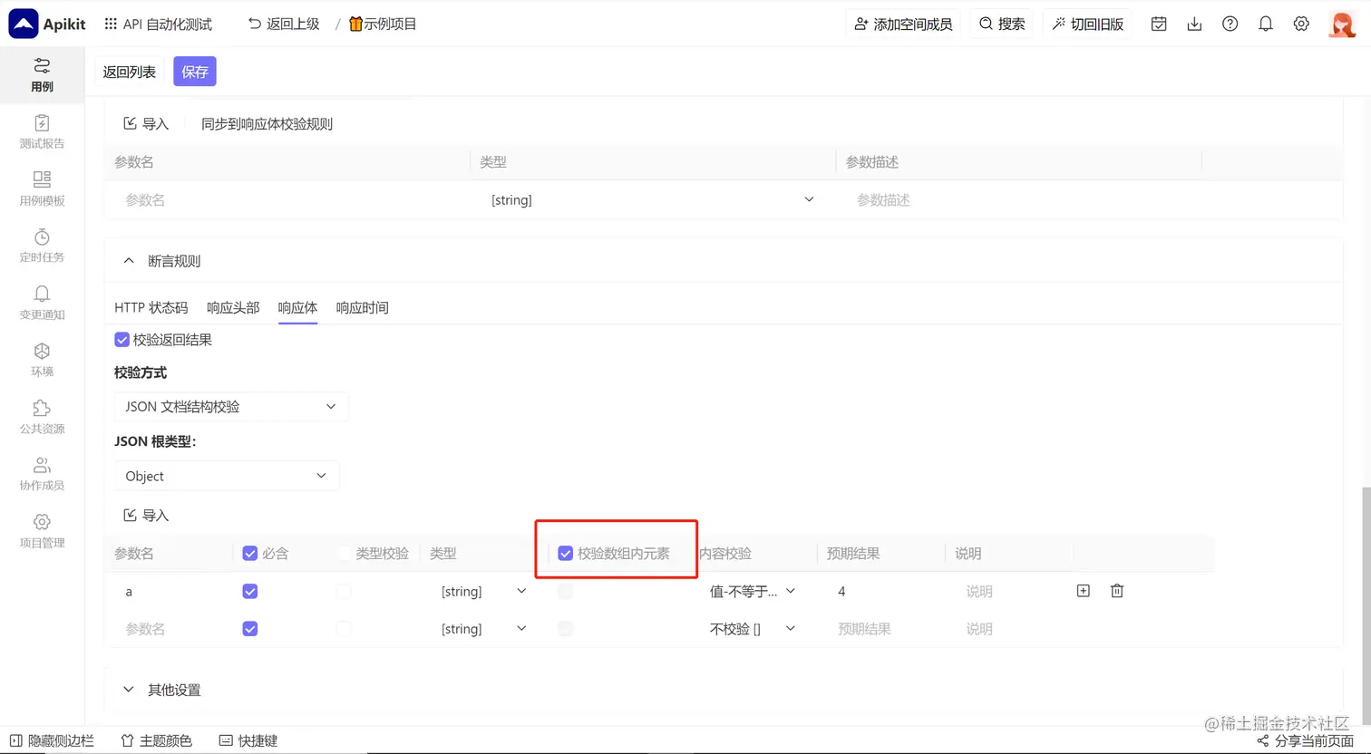 对于数组类型(Array[])的返回参数,API 自动化测试平台 提供了循环校验的选项,开启该选项之后,API 自动化测试平台 会对数组内的所有元素进行校验,否则仅校验数组内的第一个元素。