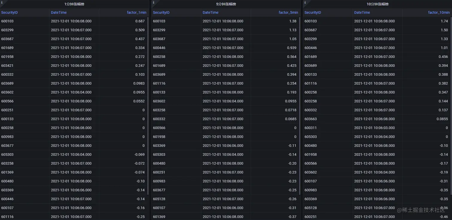本教程示例代码计算了 1 分钟,5 分钟,10 分钟涨幅榜。