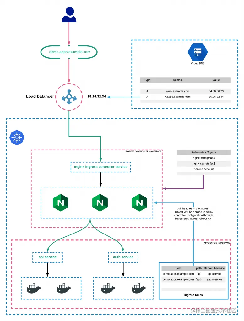 - Nginx controller与Kubernetes ingress API 通信以检查是否为流量路由创建了规则。
