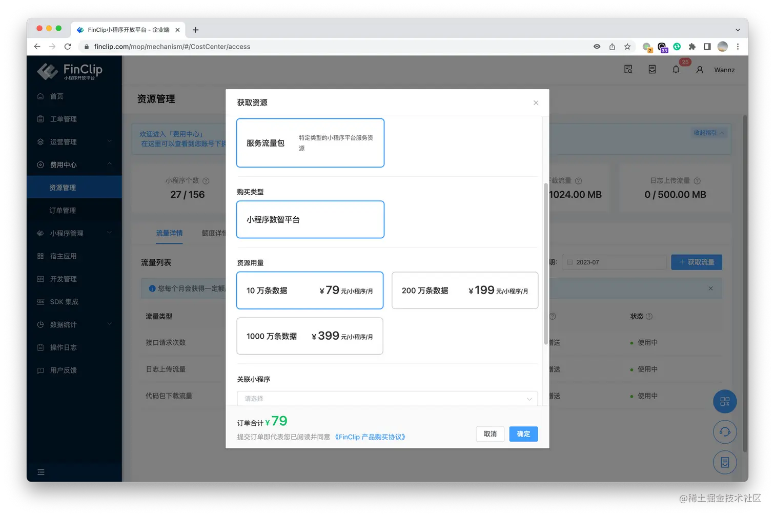 在最新版本的 FinClip SaaS 中,您可以点击左侧目录中的「费用中心 - 资源管理」获得小程序数智平台的资源流量包。