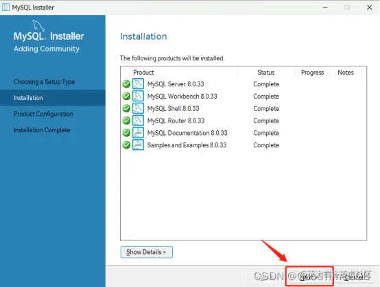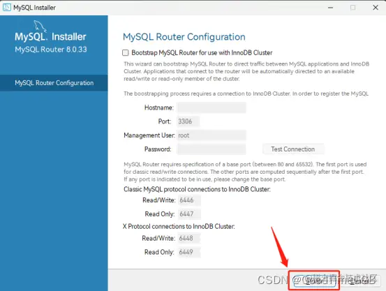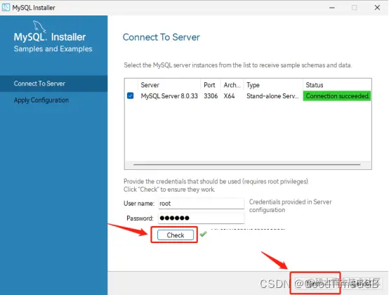 15)输入之前输入的root账户密码,点击“check”按钮检查账户密码是否正确,若正确上方会显示绿色底纹的“Connection succeeded”,接着点击“Next”按钮