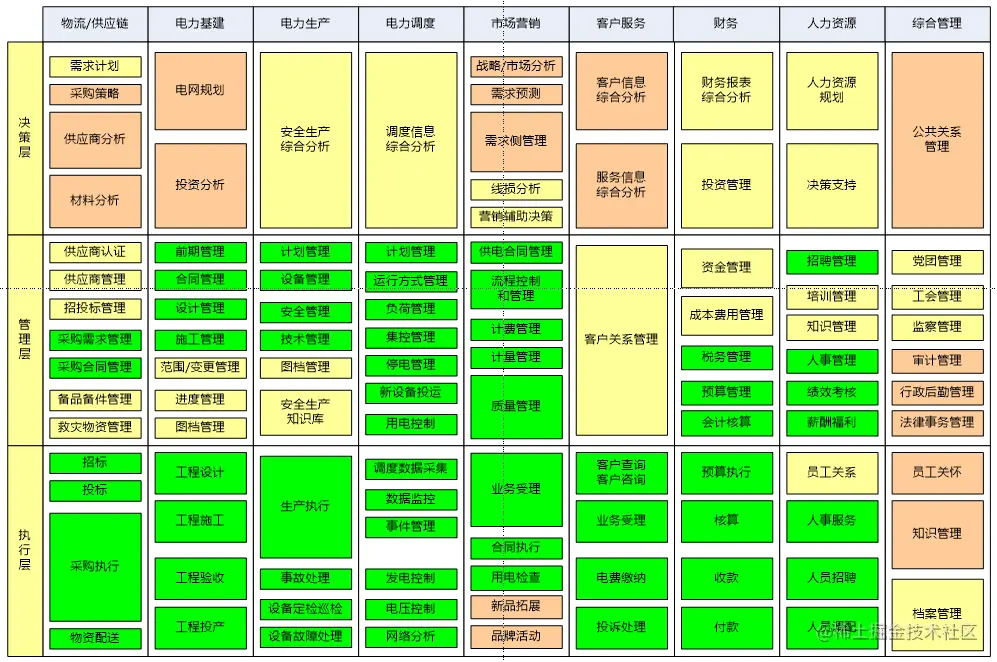 这种方式类似矩阵构图,既要体现价值链,又要体现横向的执行-管理-决策的分层。还有一种方式就是弱化横向分层的业务能力架构图,参考如下: