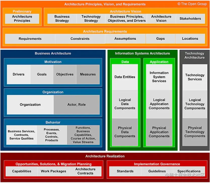 不论哪种定义都需要看到,企业架构包括了业务架构+IT架构。对于TOGAF整体架构框架里面IT架构本身又包括了数据架构,应用架构和技术架构三大部分的内容。