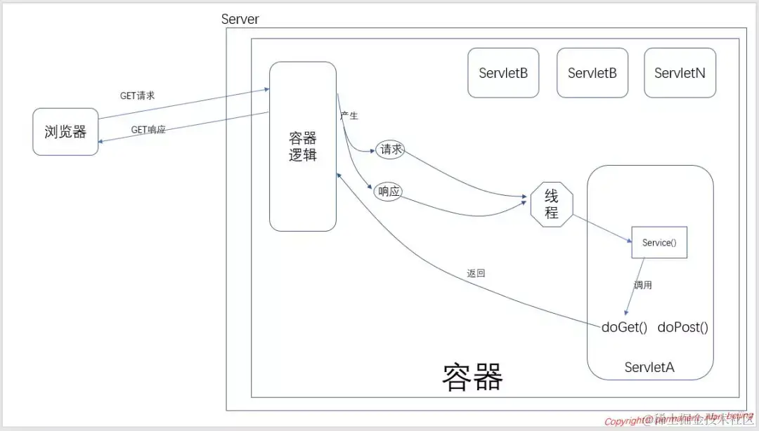 1. 浏览器向服务器发出GET请求(请求服务器ServletA)