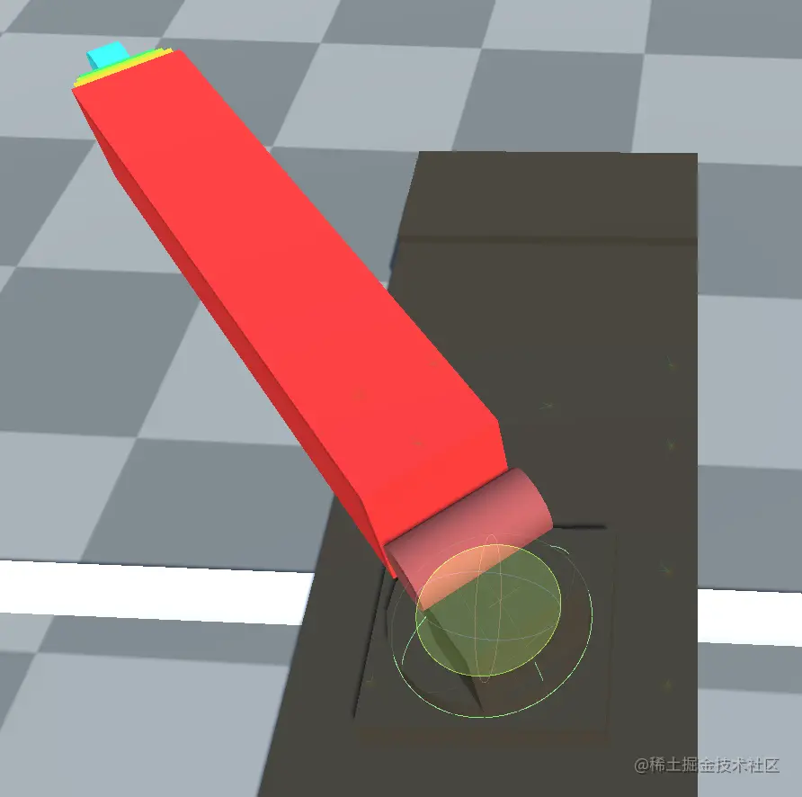 抬升的做法有一点trick,对于一般的吊车这里通常是液压的,由下面的浅红色小臂通过液压给力然后把红色的大臂推出去。大臂配置一个绕轴旋转。但是笔者经过尝试,发现这种通过给力的方式在车子运动起来的同时大臂会摇摇晃晃,因为是通过力来作用的,就很容易出现弹簧一样的感觉,并且也不利于控制具体的抬升角度。
