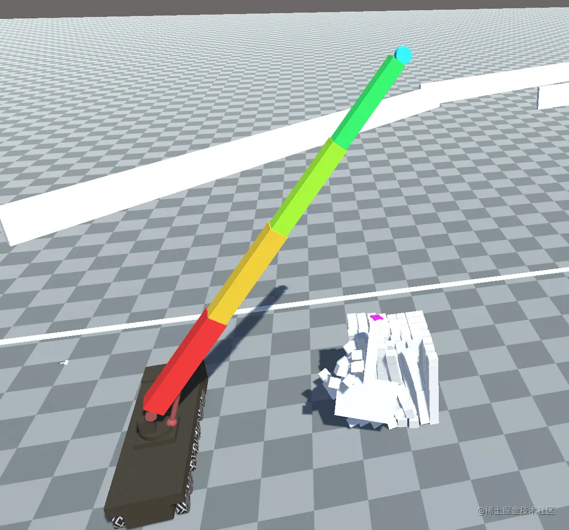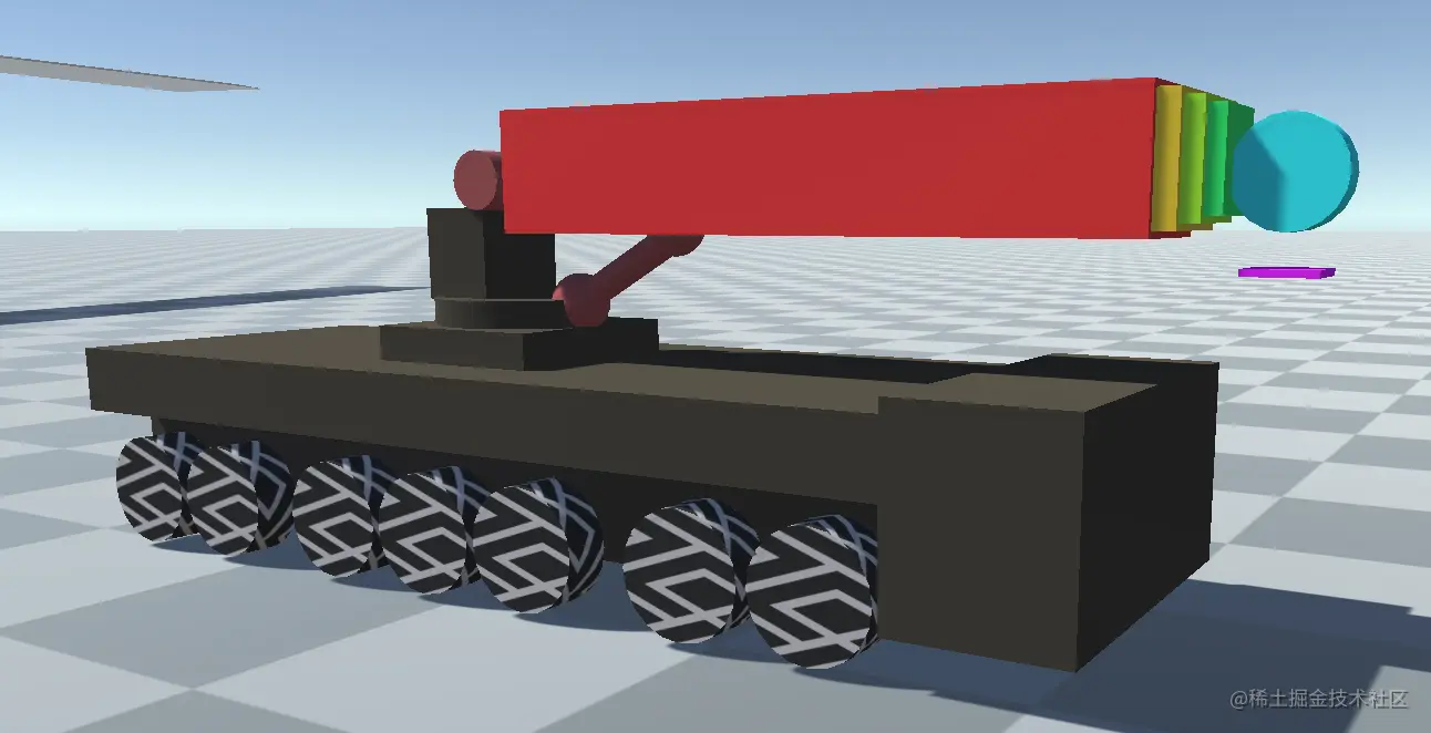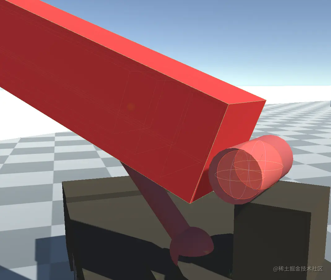 吊车的大臂可以以转台为中心来做旋转,我们以y为上方向 配置angular y motion为free,然后在运行时根据输入来配置target rotation,可以实现大臂绕着一个点旋转,通过把drive和damp同时拉大可以获得一个有些重量感的吊臂。
