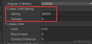 需要注意的是xyz都是共享一个limit的,只存在anchor之间 按线运动、按圆圈运动、在球体范围内运动三种情况。默认spring是0,表示没有任何弹簧就是一个很刚性的约束(看起来非常硬)。damper标志了弹簧震动的阻尼系数,阻尼会根据刚体运动速度产生一个反向的作用力,以降低震动的频率。