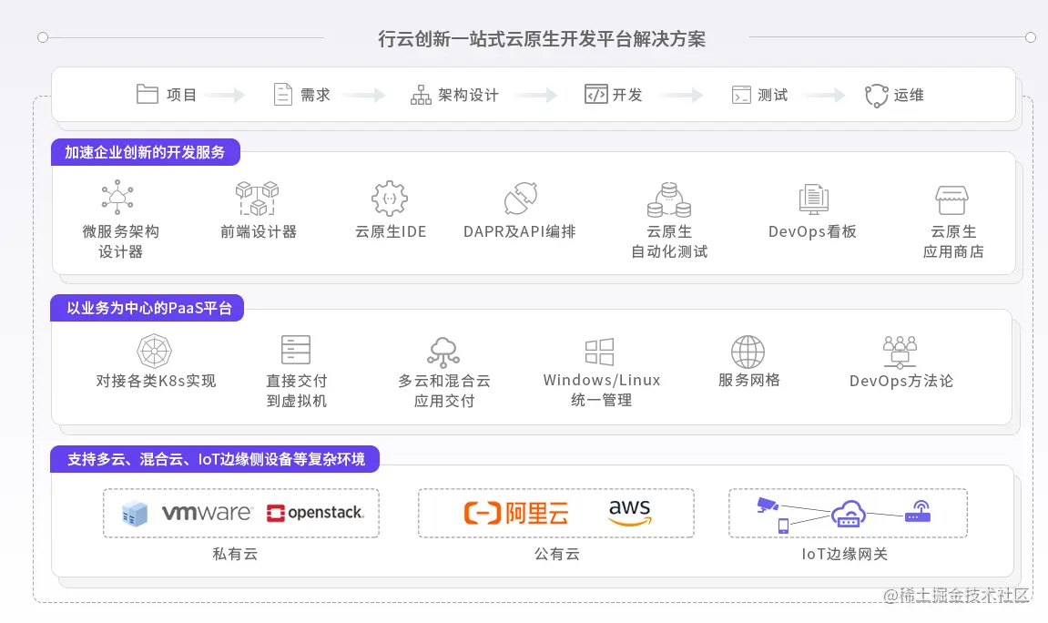 CloudOS行云创新专注打造一站式云原生开发平台——CloudOS,支持软件的全生命周期管理,为企业提供应用上云、微服务改造、落地云原生DevOps、多云业务调度及管理、可视化微服务治理等一站式云原生解决方案,灵活满足企业数字化建设中各种场景的需要,更高效、专注的沉淀业务和数据能力,快速地应对当前快节奏的市场需求,加速企业数字化转型。