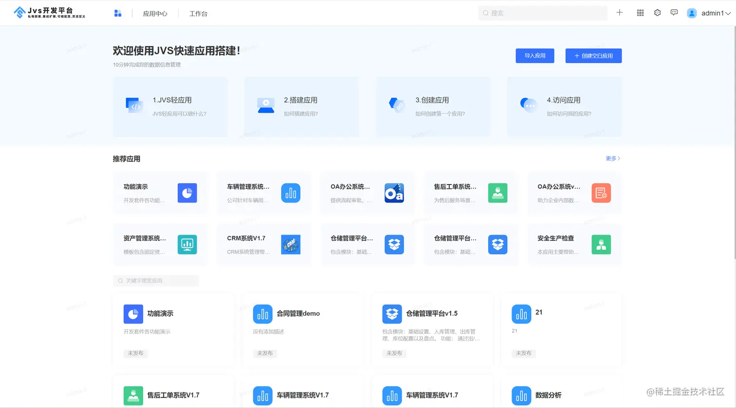 应用配置中心是具备应用管理员权限的账号可以看到应用配置中心,进入应用配置中心可以创建、配置管理自己的应用,也能进入模板中心,通过模板创建应用。