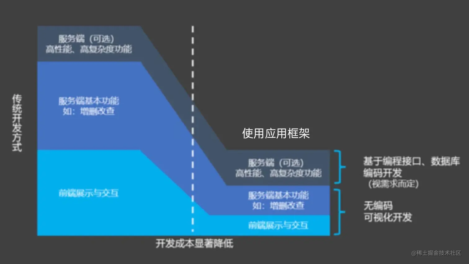 从公司层面看,一方面,通用的应用框架可以实现大部分功能的快速搭建,通过提升开发效率、缩短交付周期,直接缩减了软件开发过程中的人力资源投入。另一方面,低代码开发还显著降低了开发人员的使用门槛。非专业开发者经过简单的IT基础培训就能快速具备使用低代码进行基础软件开发的能力,快速扩充软件开发团队。团队组成的优化能够大幅降低对昂贵专业开发者资源的依赖,进一步降低软件开发成本。