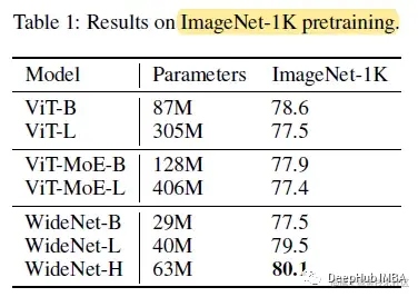 在ImageNet-1K上,WideNet-H实现了最佳性能,显著优于ViT和ViT- moe模型。