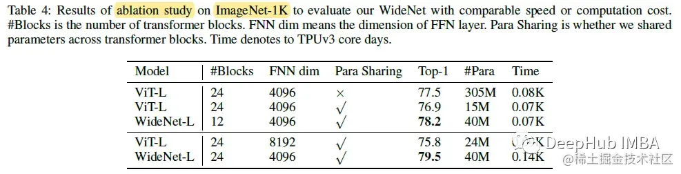 当WideNet-L比viti - l使用更少的Transformer块(即12个块)时,WideNet-L的性能比viti - l高0.7%,训练时间略少,而参数仅为13.1%,与参数共享的viti - l相比,性能则提升幅度更大。