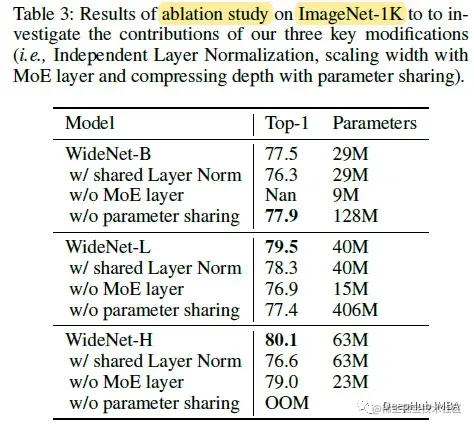 如果没有跨Transformer块的参数共享,也会有轻微的性能下降和显著的参数增量。对于没有参数共享的WideNet-H,在256个TPUv3核上训练时遇到内存不足的问题。