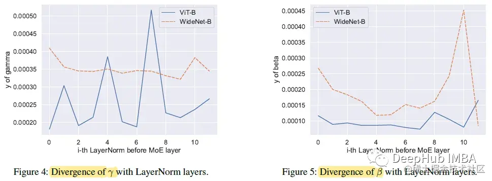 式中N为Transformer块的个数,M为向量γ或β的维数。所以WideNet中的γ和β都比ViT中的y大,这意味着MoE比ViT接受更多样化的输入。