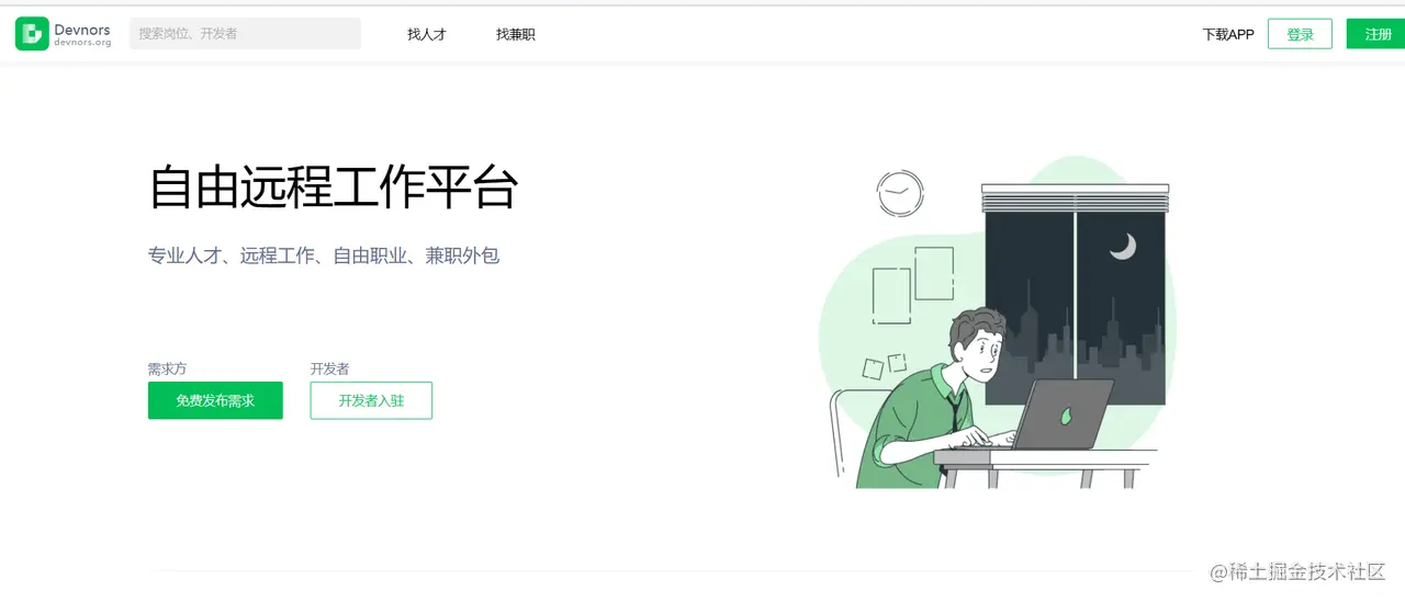 devnors是一个国外的自由远程工作平台,上面的项目多是一些海外的项目,对于新手程序员会有点挑战,但也能更接近国外的culture和技术栈,可以迅速拓宽你的眼界。