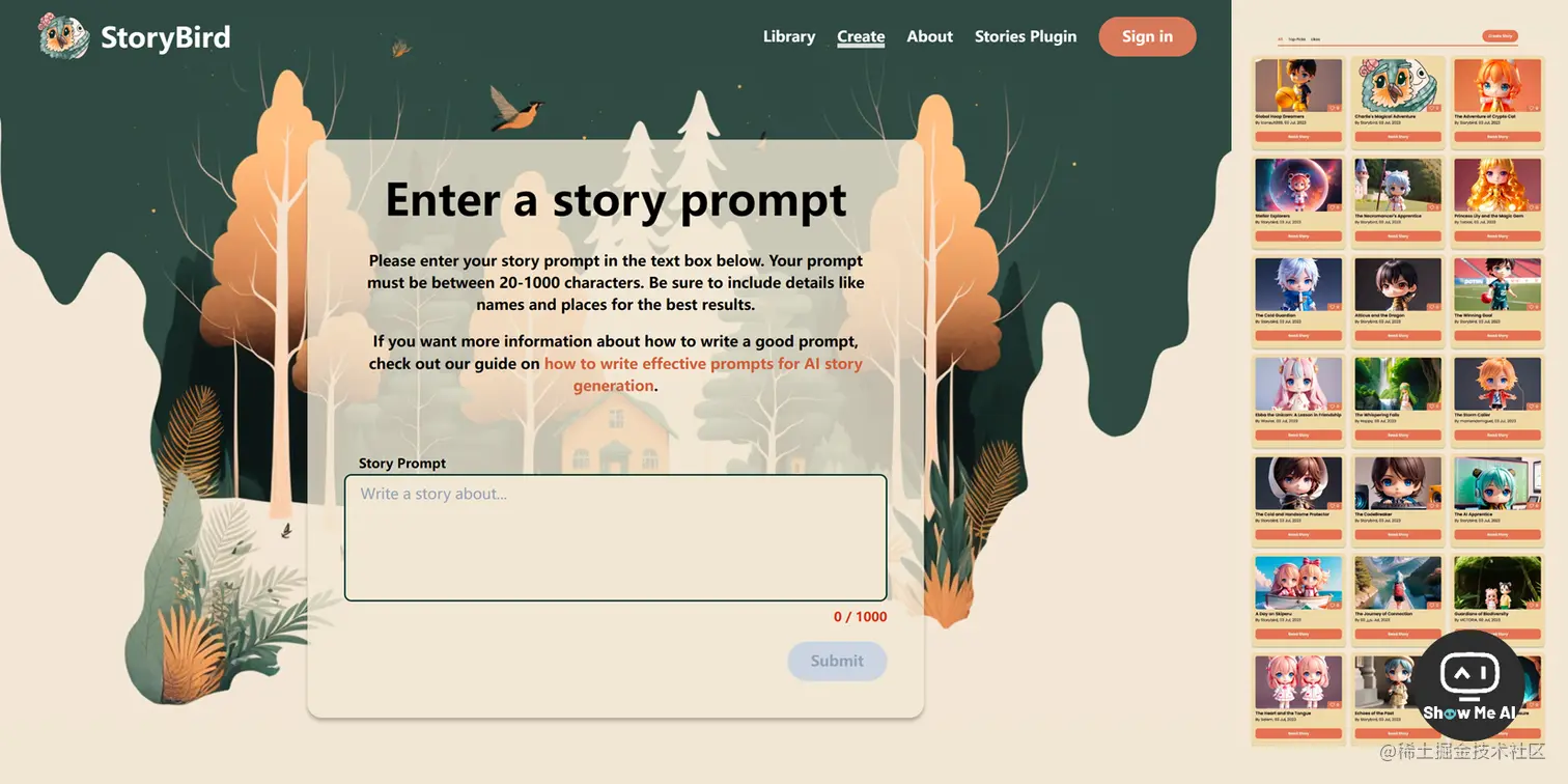 网站还贴心地给出了提示词指南和示例,帮助生成更满意的绘本故事和插图:storybird.ai/chatgpt-sto…