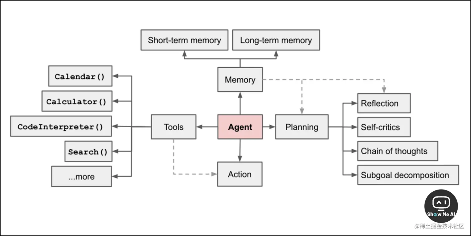 AI Agent 被认为是 OpenAI 发力的下一个方向。Lilian 将 Agents 定义为 LLM、Planning、Memory、Tools的集合,并在文章中对每个组建的实现路径进行了细致说明: