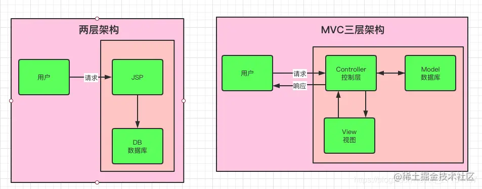 **都知道叫做spring mvc,mvc是什么东东呢?**其实就是三层架构, 在过去架构都是两层的,就是浏览器通过servlet后直接访问JSP页面,也就是说所有的java代码都是在jsp页面里面写的,就连访问数据库也是在jsp页面,小型项目这样开发没什么问题,因为快嘛,但是大型项目是需要迭代的,是需要增加功能和模块的,你这么写的话,我后期维护起来很麻烦啊;而且java代码和html标签混搭,这样代码的可读性也不高;所以就衍生出了MVC三层架构