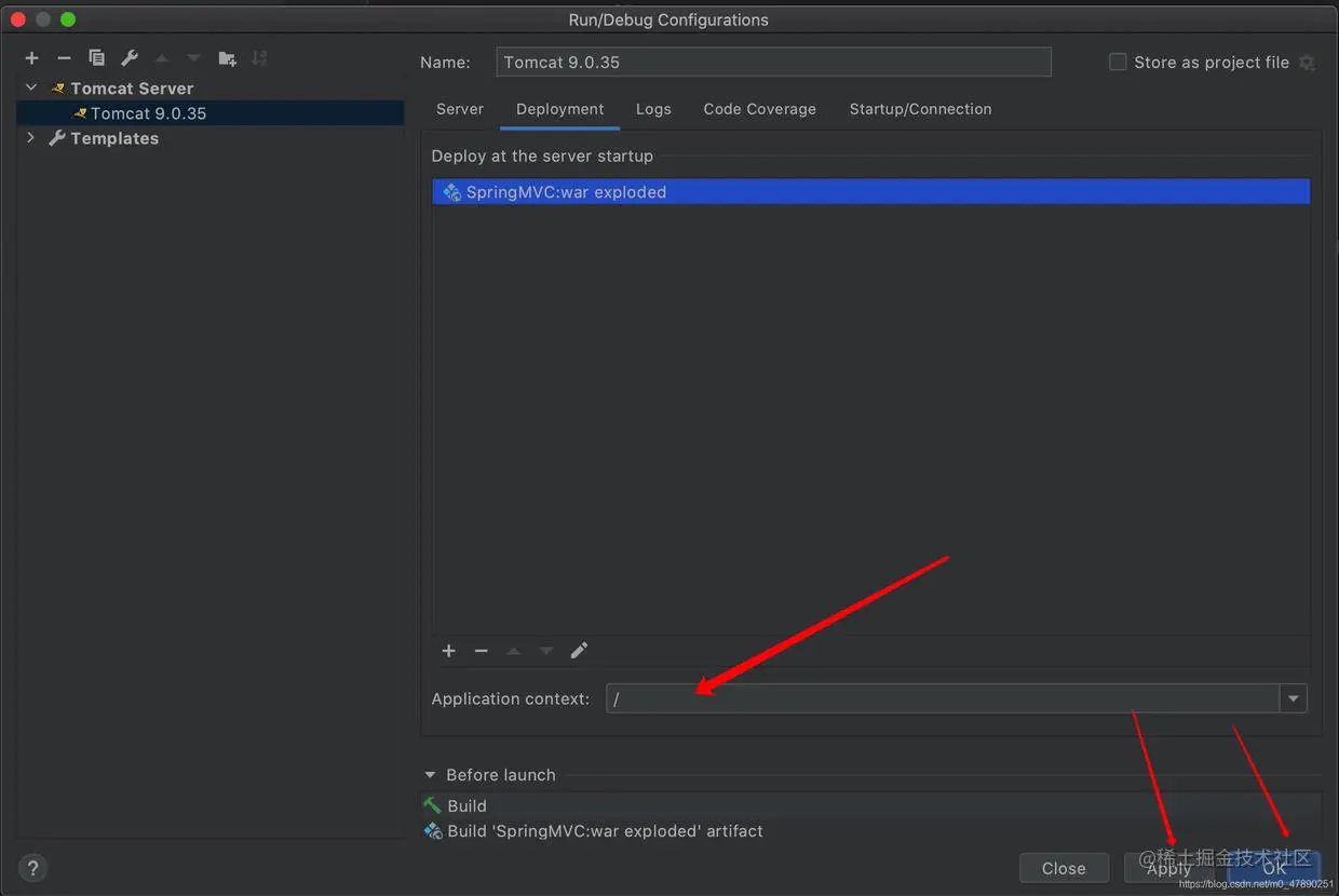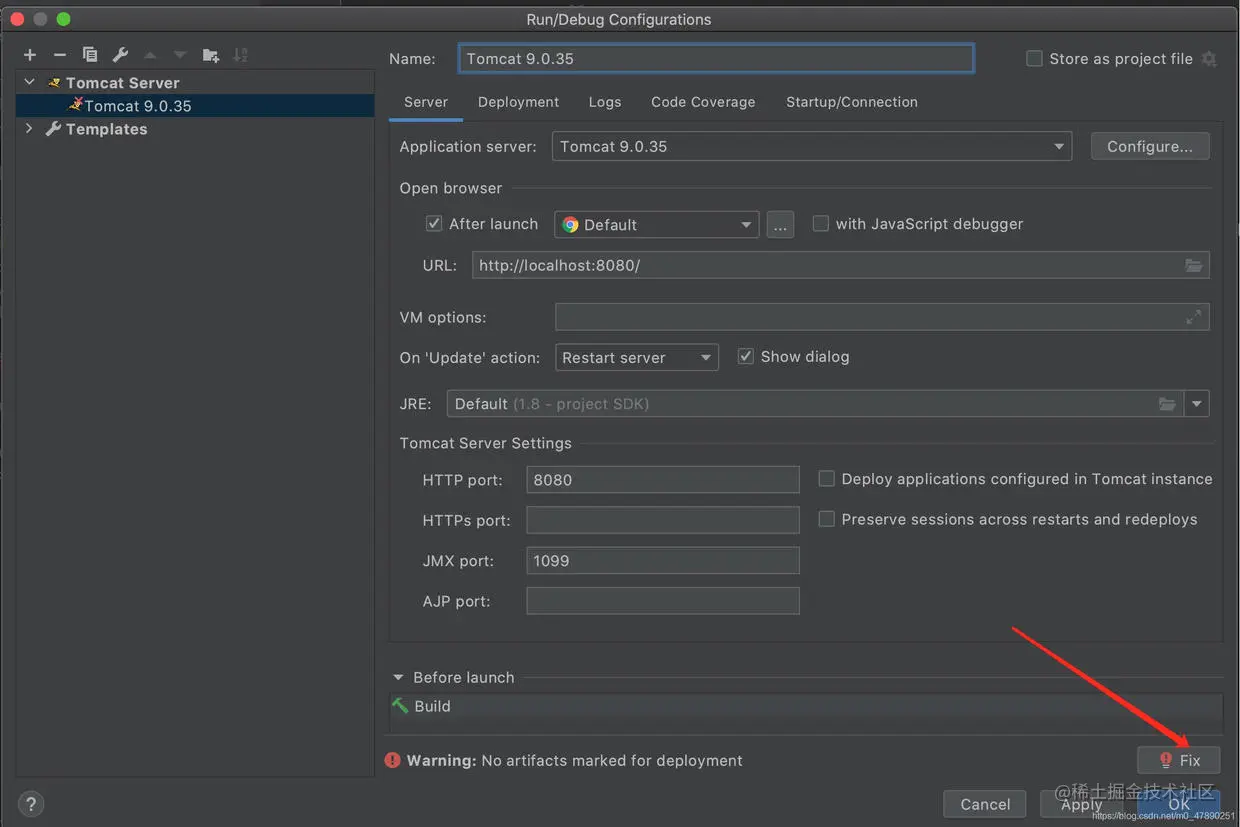 步骤3:点击右下角的Fix。修改Application context为/,接着点击Apply->OK。