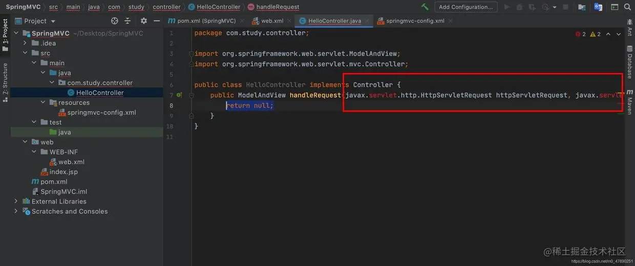 在重写Controller接口中的handleRequest方法时,可能会出现如下报错: