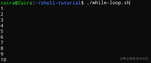 在下面的示例中,(( i += 1 ))是递增 的值的计数器语句i。该循环将恰好运行 10 次。