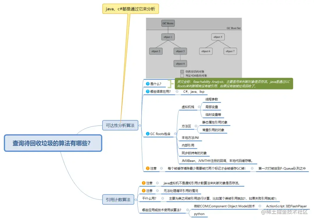 3.垃圾回收算法:Java的垃圾回收机制采用的是可达性分析算法。该算法通过判断对象是否可达(即是否可以通过根对象(如局部变量、类的静态变量等)追溯到)来确定其是否存活。如果对象不可达,则被认为是垃圾,可以被回收。
