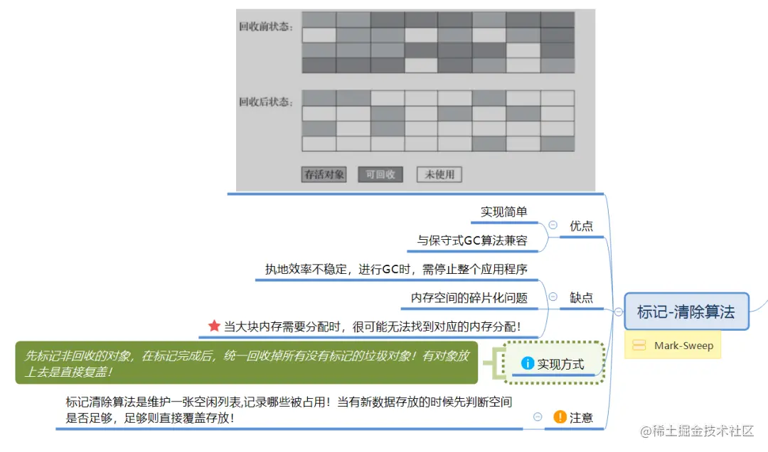 标记-清除算法(Mark-Sweep)是一种非常基础和常见的垃圾收集算法,该算法被 J.McCarthy 等人在1960年提出并并应用于Lisp语言。