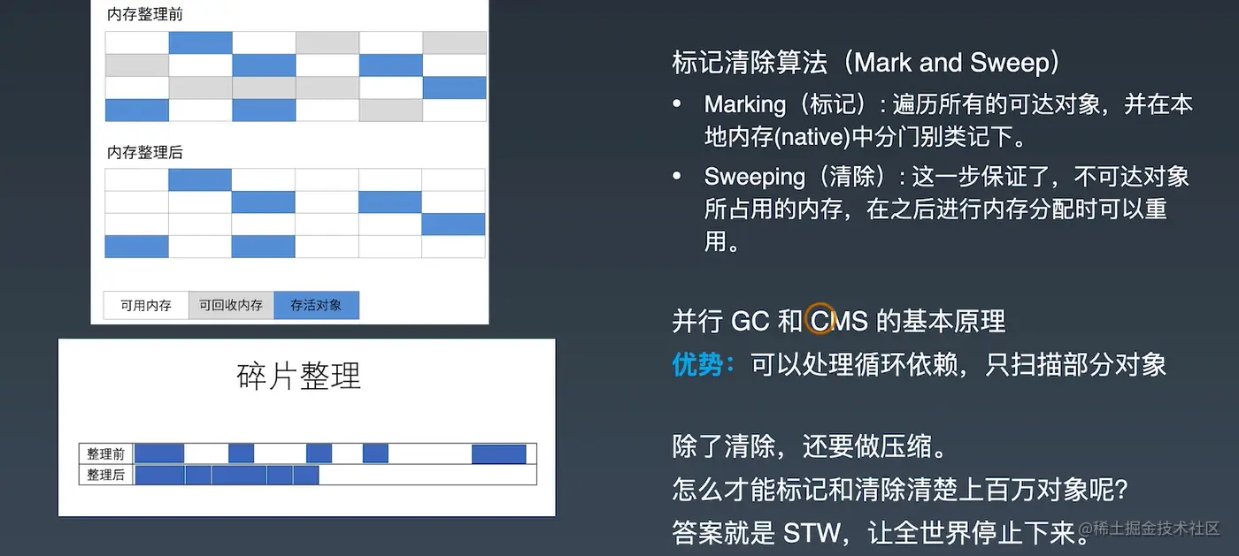 注意: 这里压缩不是说的标记清除算法而是以后的其它算法。比如标记-压缩算法(Mark-Compact Algorithm)和标记-整理算法(Mark-Sweep-Compact Algorithm)等。