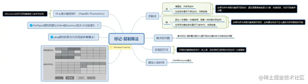 复制(Copying)算法是为了解决标记-清除算法,的效率和收集的时间空间不连续等问题。主要的实现是将空间分为两份,将存活的对象移到另外一份,标记完后,将原来的空间清除,这样的话空间是连续的,并且效率较高。