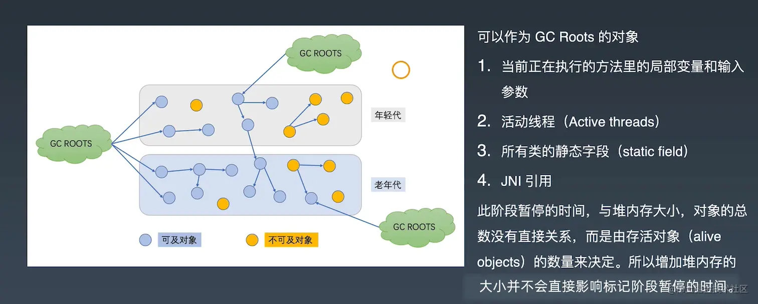 此阶段暂停的时间,与堆内存大小,对象的总数没有直接关系,而是由存活对象 (aliveobiects) 的数量来决定。所以增加堆内存的大小并不会直接影响标记阶段暂停的时间。