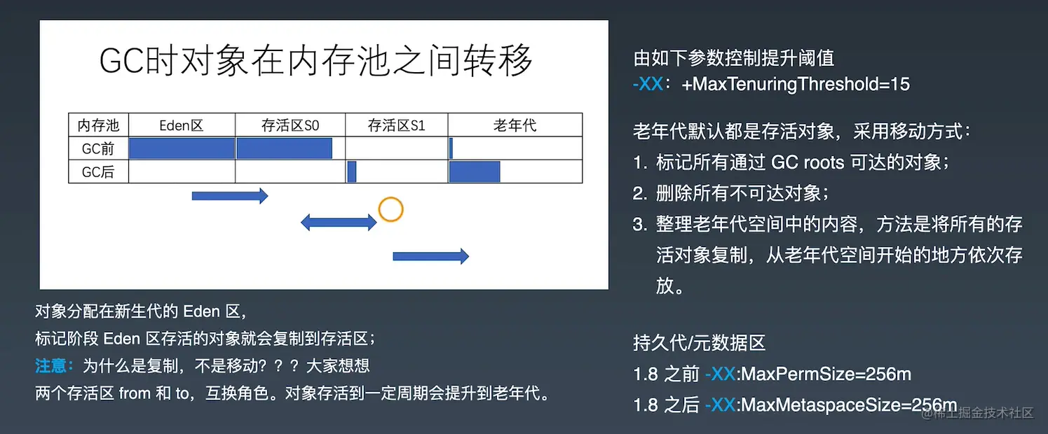 - 此后,对象会在From区和To区之间进行复制,年龄达到一定阈值(通常是15岁)的对象将会被晋升到老年代。