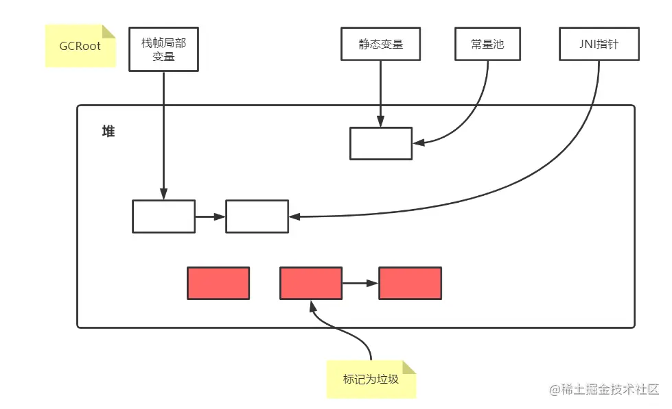 如果⽬标对象没有任何引⽤链相连,则是不可达的,就意味着该对象已经死亡,可以标记为垃圾对象;
