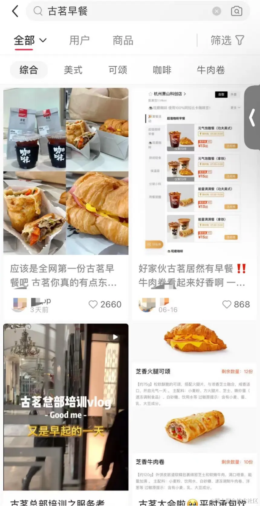从帖子可以看到,杭州的古茗门店上架了早餐产品,从美式到拿铁,火腿可颂到牛肉卷……叠上优惠活动,只要13元就能带走一份咖啡+烘焙产品的早餐。