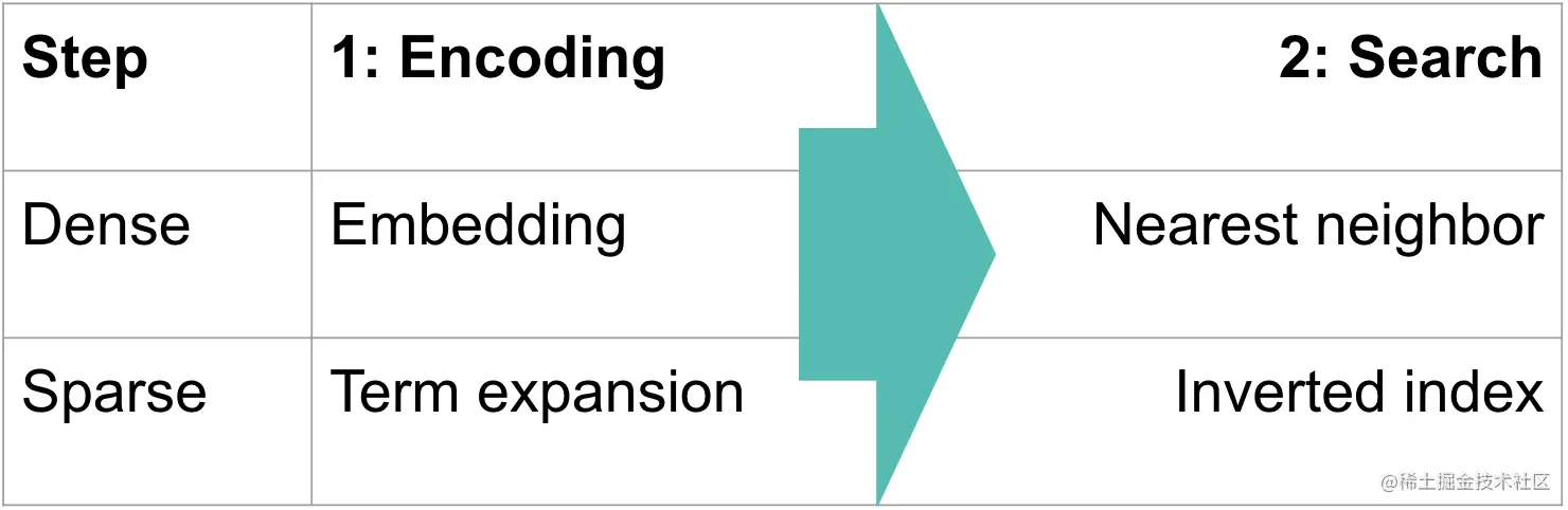 检索方法有两大类,通常称为 “密集(dense)” 和 “稀疏(sparse)”。 两者都使用文本的矢量表示形式,对含义和关联进行编码,并且都将搜索紧密匹配作为第二步,如下图所示。 所有基于矢量的检索方法都有一个共同点。