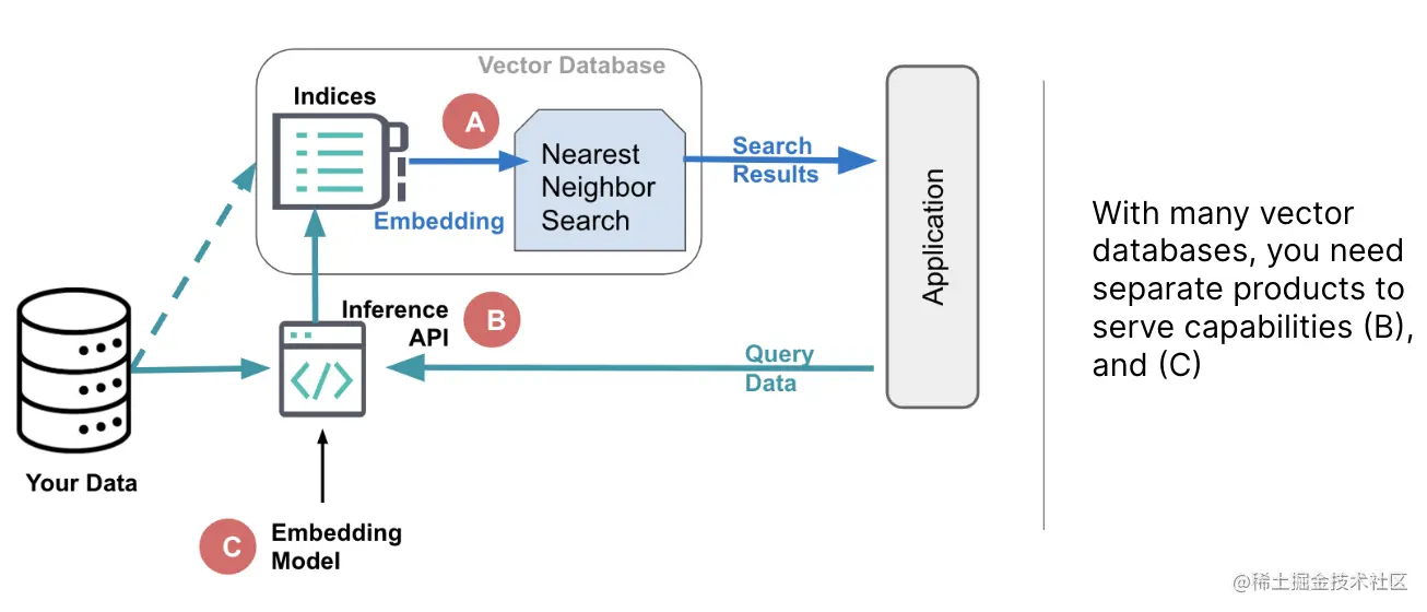 一些矢量数据库仅提供存储和搜索嵌入的功能,如上图中的 A 所示。 然而,这种方法给开发人员带来了如何生成这些嵌入的挑战。 通常,这需要访问嵌入模型(显示为 C)和 API 以将其应用到你的数据和查询 (B)。 而且你可能只能存储非常有限的元数据以及嵌入,这使得在用户应用程序中提供全面的信息变得更加复杂。