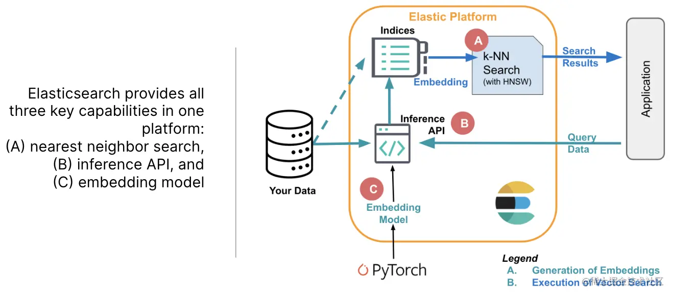 与专用矢量数据库相比,Elastic 在单个平台中支持三种功能,这对于实现矢量搜索支持的应用程序至关重要:存储嵌入 (A)、有效搜索最近邻居 (B) 以及将文本嵌入到矢量表示中 (C) 。