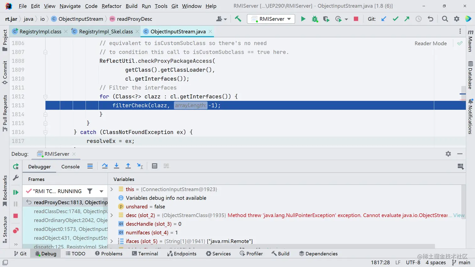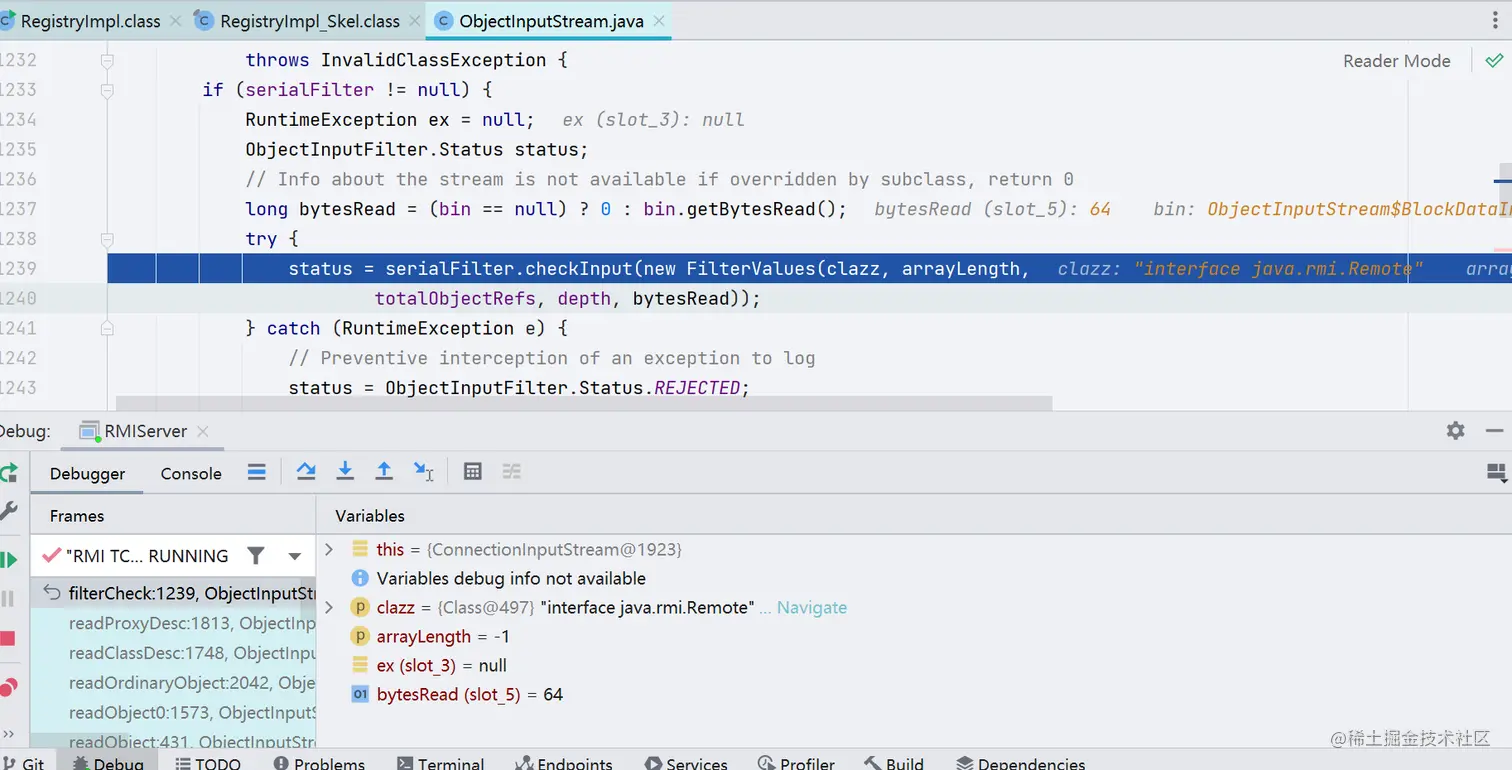 我这里去看了看 ObjectInputFilter 相关的类,断点是下不去的,所以去到控制台去看,发现在 RegistryImpl_Skel 类中也存在报错现象,而这个类在 RMI 中是用来做反序列化的方法的。