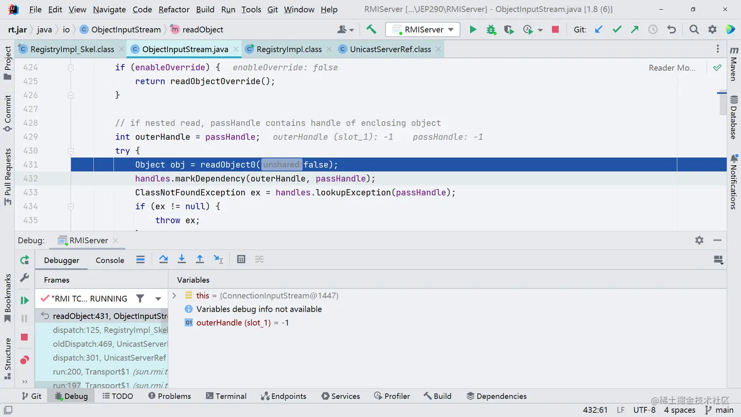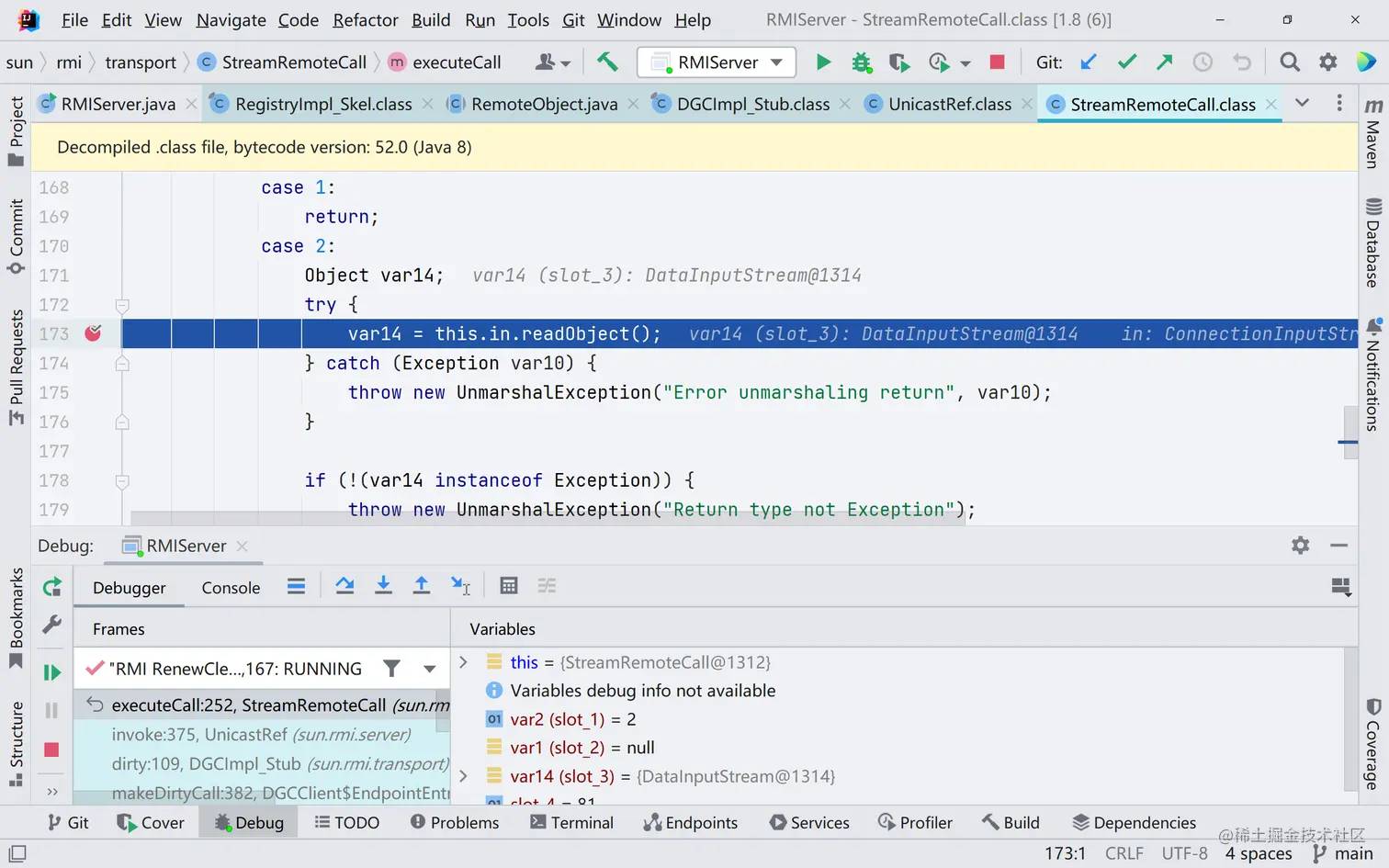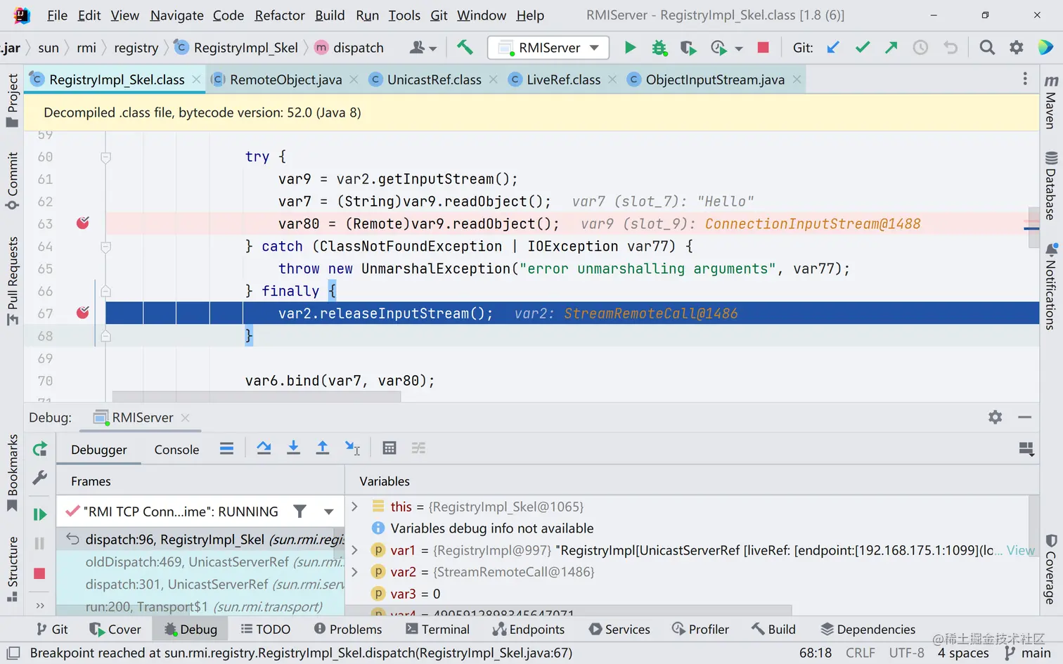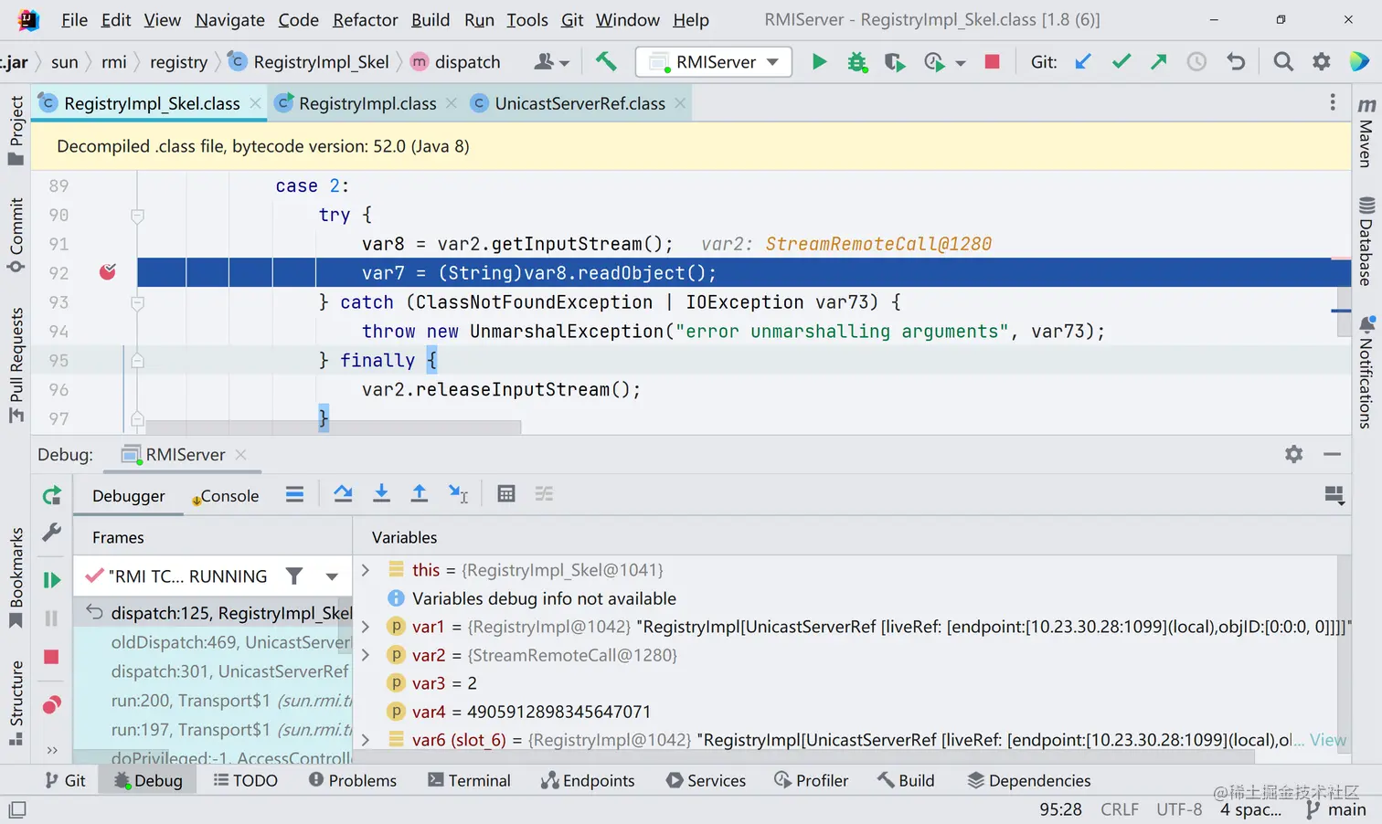 readObject:455, RemoteObject (java.rmi.server)invoke0:-1, NativeMethodAccessorImpl (sun.reflect)invoke:62, NativeMethodAccessorImpl (sun.reflect)invoke:43, DelegatingMethodAccessorImpl (sun.reflect)invoke:498, Method (java.lang.reflect)invokeReadObject:1170, ObjectStreamClass (java.io)readSerialData:2178, ObjectInputStream (java.io)readOrdinaryObject:2069, ObjectInputStream (java.io)readObject0:1573, ObjectInputStream (java.io)defaultReadFields:2287, ObjectInputStream (java.io)readSerialData:2211, ObjectInputStream (java.io)readOrdinaryObject:2069, ObjectInputStream (java.io)readObject0:1573, ObjectInputStream (java.io)readObject:431, ObjectInputStream (java.io) // 从此处开始,会遇到很多字节码不匹配的问题dispatch:92, RegistryImpl_Skel (sun.rmi.registry)oldDispatch:469, UnicastServerRef (sun.rmi.server)dispatch:301, UnicastServerRef (sun.rmi.server)run:200, Transport$1 (sun.rmi.transport)run:197, Transport$1 (sun.rmi.transport)doPrivileged:-1, AccessController (java.security)serviceCall:196, Transport (sun.rmi.transport)handleMessages:573, TCPTransport (sun.rmi.transport.tcp)run0:834, TCPTransport$ConnectionHandler (sun.rmi.transport.tcp)lambda$run$0:688, TCPTransport$ConnectionHandler (sun.rmi.transport.tcp)run:-1, 1330984495 (sun.rmi.transport.tcp.TCPTransport$ConnectionHandler$$Lambda$5)doPrivileged:-1, AccessController (java.security)run:687, TCPTransport$ConnectionHandler (sun.rmi.transport.tcp)runWorker:1149, ThreadPoolExecutor (java.util.concurrent)run:624, ThreadPoolExecutor$Worker (java.util.concurrent)run:748, Thread (java.lang)