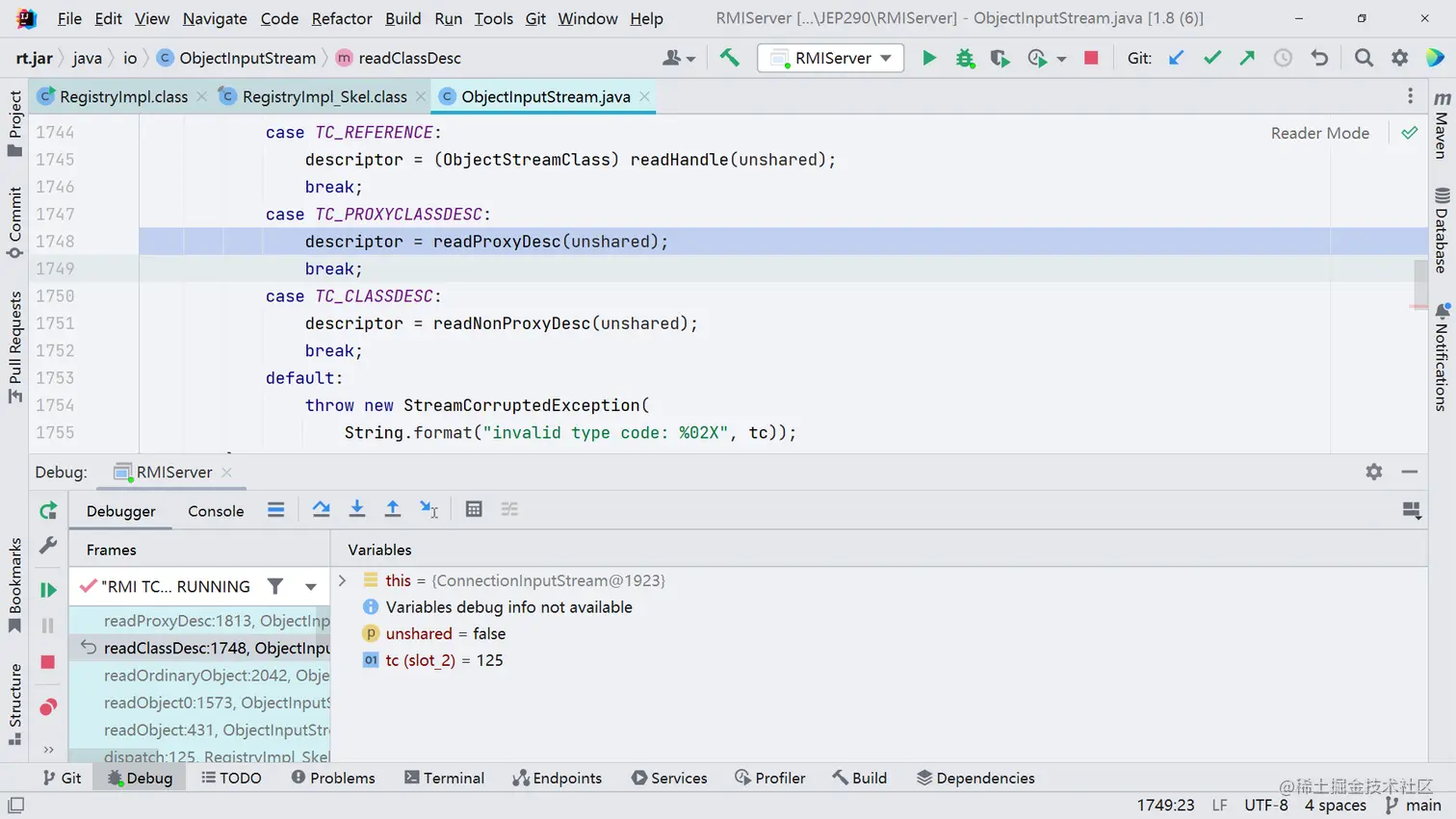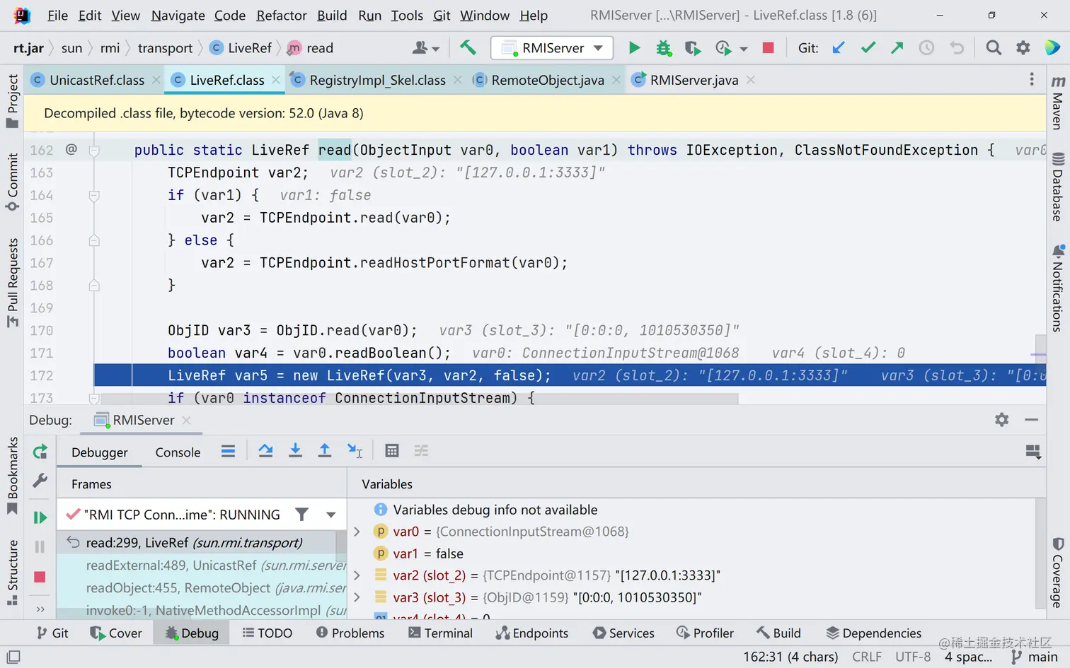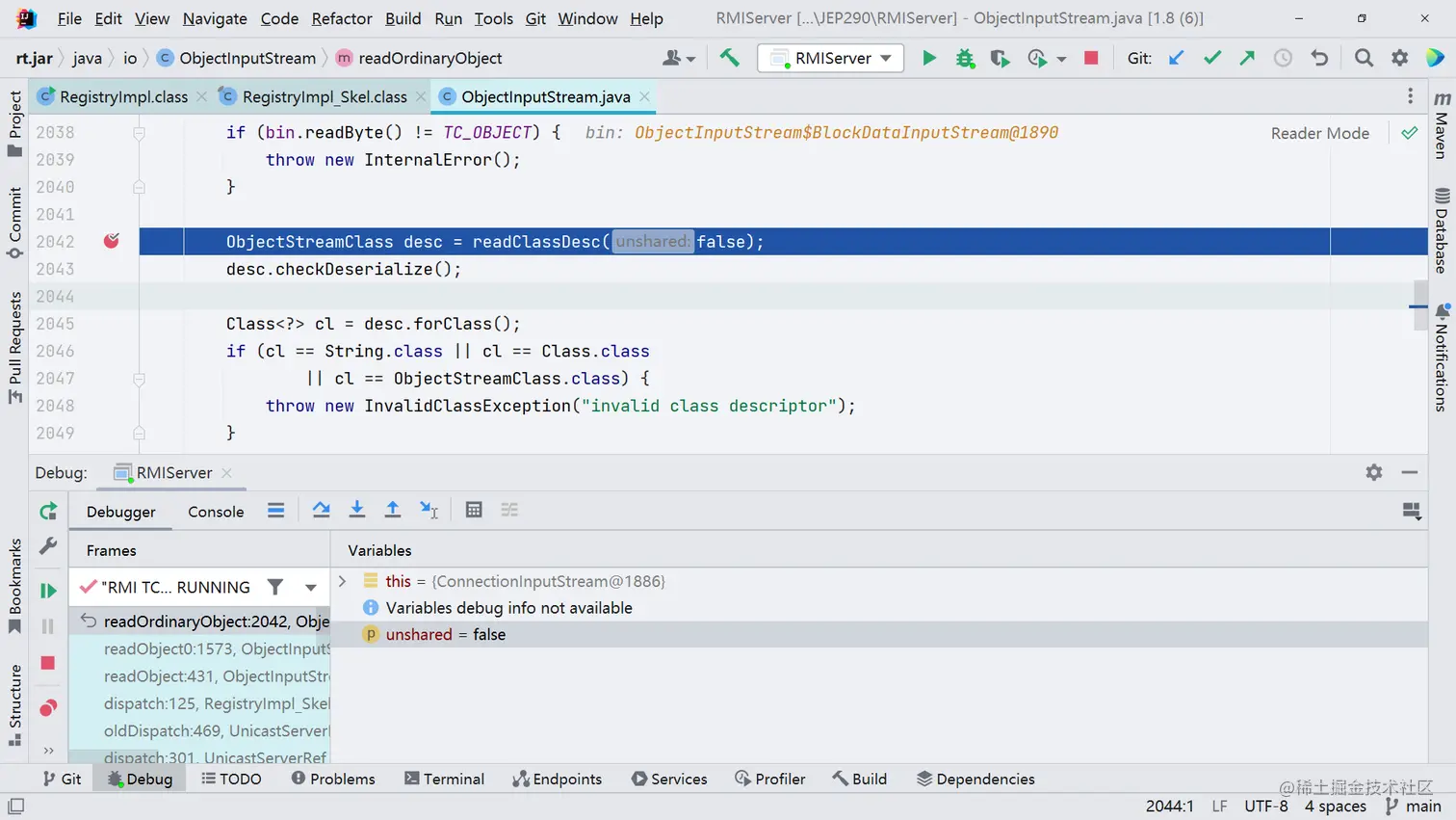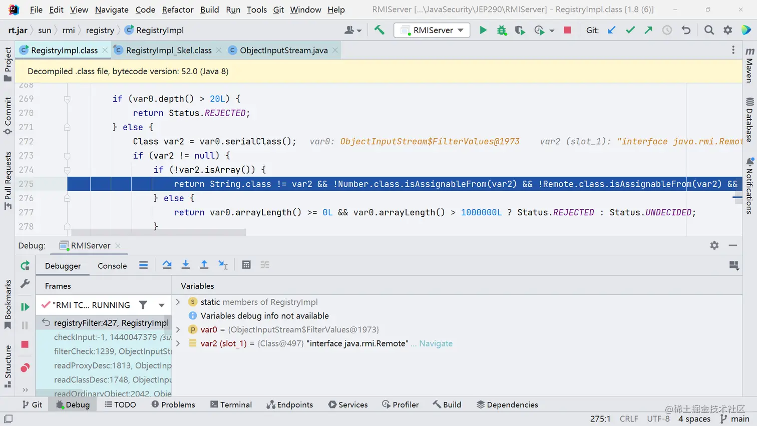 readObject:455, RemoteObject (java.rmi.server)invoke0:-1, NativeMethodAccessorImpl (sun.reflect)invoke:62, NativeMethodAccessorImpl (sun.reflect)invoke:43, DelegatingMethodAccessorImpl (sun.reflect)invoke:498, Method (java.lang.reflect)invokeReadObject:1170, ObjectStreamClass (java.io)readSerialData:2178, ObjectInputStream (java.io)readOrdinaryObject:2069, ObjectInputStream (java.io)readObject0:1573, ObjectInputStream (java.io)defaultReadFields:2287, ObjectInputStream (java.io)readSerialData:2211, ObjectInputStream (java.io)readOrdinaryObject:2069, ObjectInputStream (java.io)readObject0:1573, ObjectInputStream (java.io)readObject:431, ObjectInputStream (java.io) // 从此处开始,会遇到很多字节码不匹配的问题dispatch:92, RegistryImpl_Skel (sun.rmi.registry)oldDispatch:469, UnicastServerRef (sun.rmi.server)dispatch:301, UnicastServerRef (sun.rmi.server)run:200, Transport$1 (sun.rmi.transport)run:197, Transport$1 (sun.rmi.transport)doPrivileged:-1, AccessController (java.security)serviceCall:196, Transport (sun.rmi.transport)handleMessages:573, TCPTransport (sun.rmi.transport.tcp)run0:834, TCPTransport$ConnectionHandler (sun.rmi.transport.tcp)lambda$run$0:688, TCPTransport$ConnectionHandler (sun.rmi.transport.tcp)run:-1, 1330984495 (sun.rmi.transport.tcp.TCPTransport$ConnectionHandler$$Lambda$5)doPrivileged:-1, AccessController (java.security)run:687, TCPTransport$ConnectionHandler (sun.rmi.transport.tcp)runWorker:1149, ThreadPoolExecutor (java.util.concurrent)run:624, ThreadPoolExecutor$Worker (java.util.concurrent)run:748, Thread (java.lang)